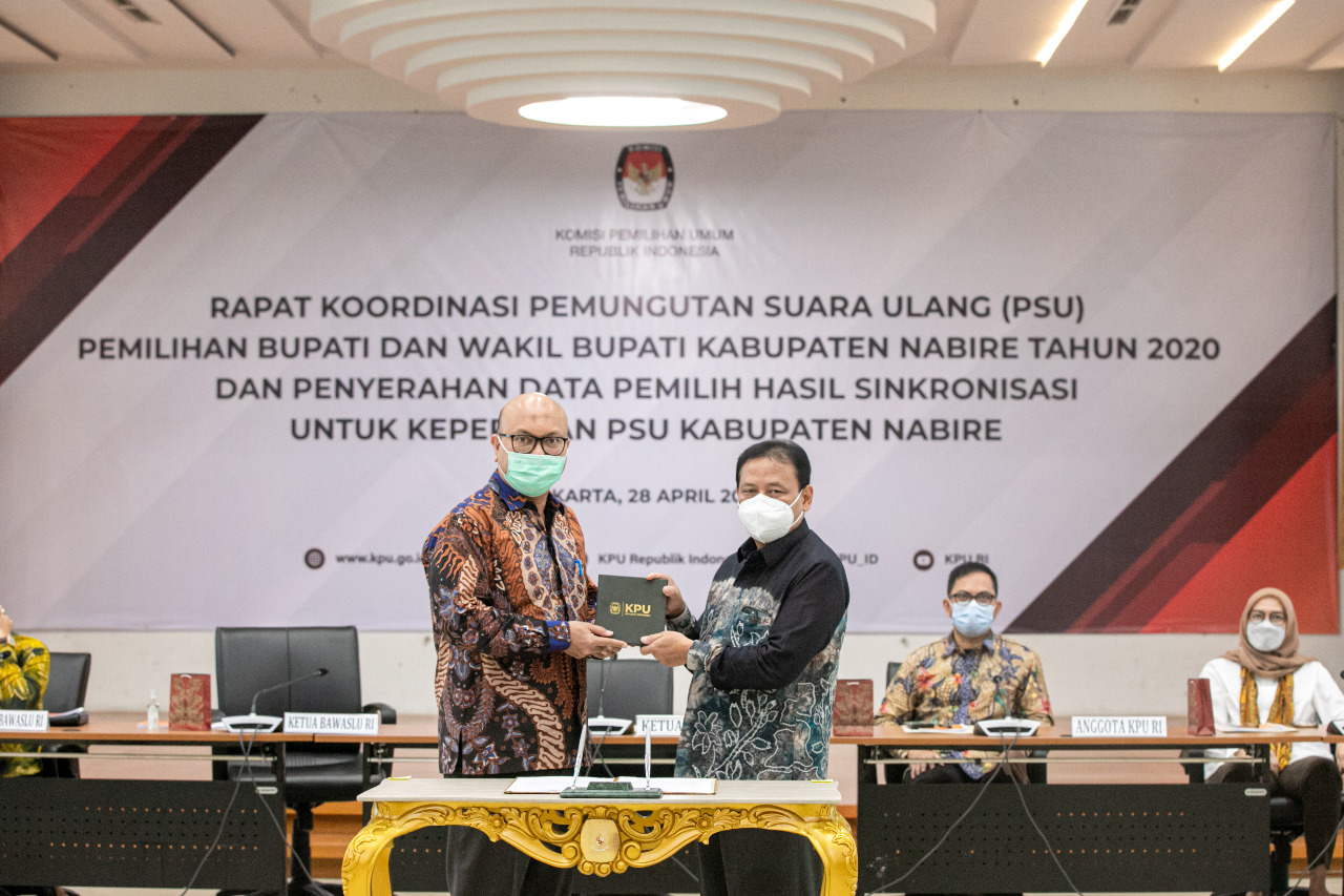 Jakarta, Badan Pengawas Pemilihan Umum - KPU bersama Bawaslu melakukan rapat koordinasi mengenai pemungutan suara ulang (PSU) Pilkada Kabupaten Nabire, Provinsi Papua. Dalam acara ini KPU menyerahkan penetapan data pemilih hasil sinkronisasi untuk keperluan PSU di Kabupaten Nabire kepada pimpinan Bawaslu.