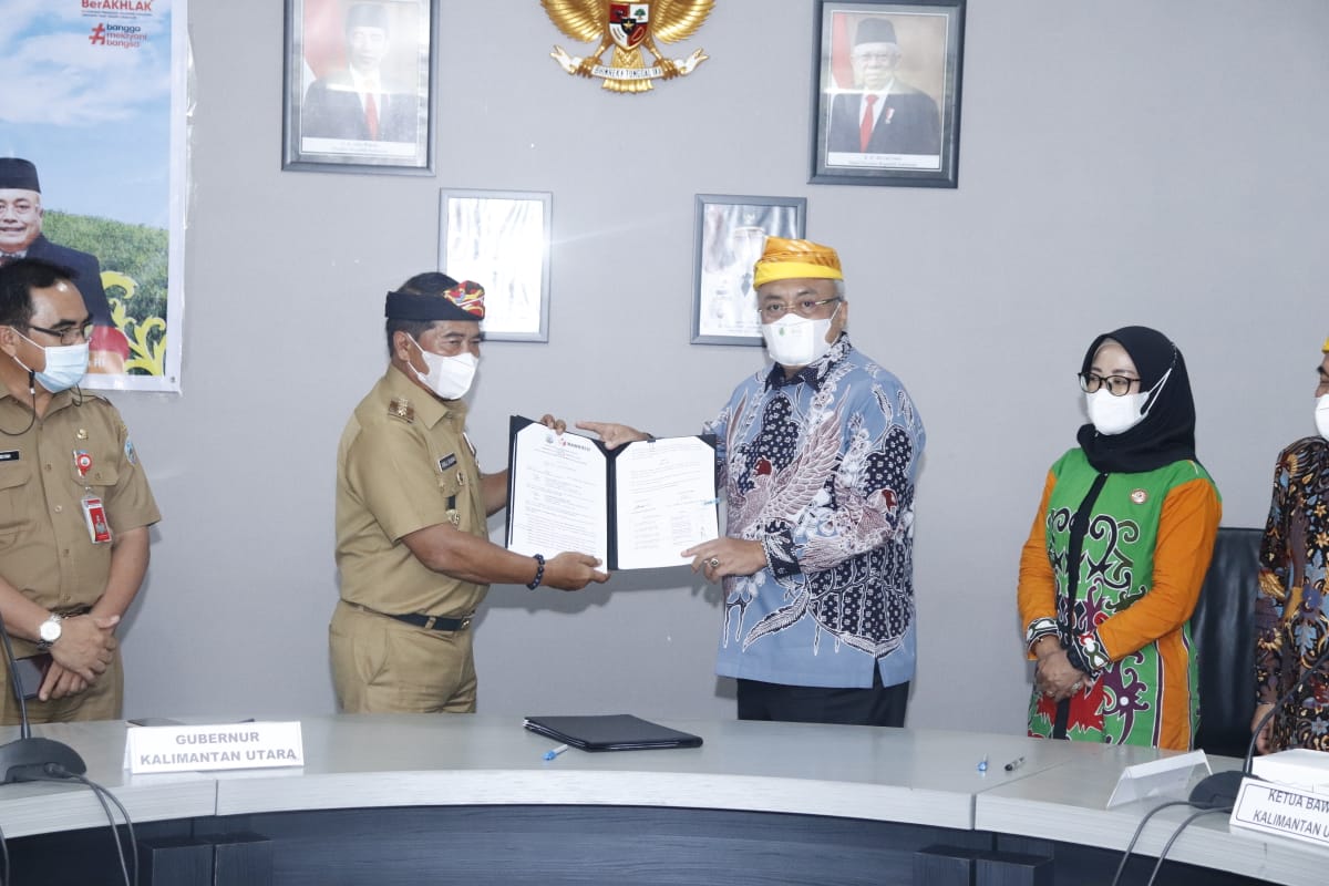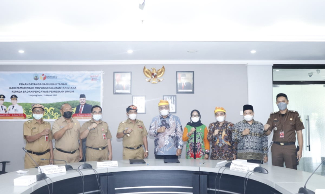 Penyerahan hibah lahan melalui penandatanganan Naskah Perjanjian Hibah Daerah (NPHD) oleh Gubernur Kaltara Zaenal A Paliwang yang diterima langsung oleh Sekretaris Jenderal Bawaslu Gunawan Suswantoro di Gedung Pemprov Kaltara, Bulungan, Selasa (15/3/2022).