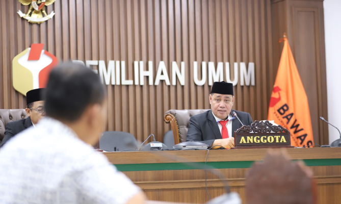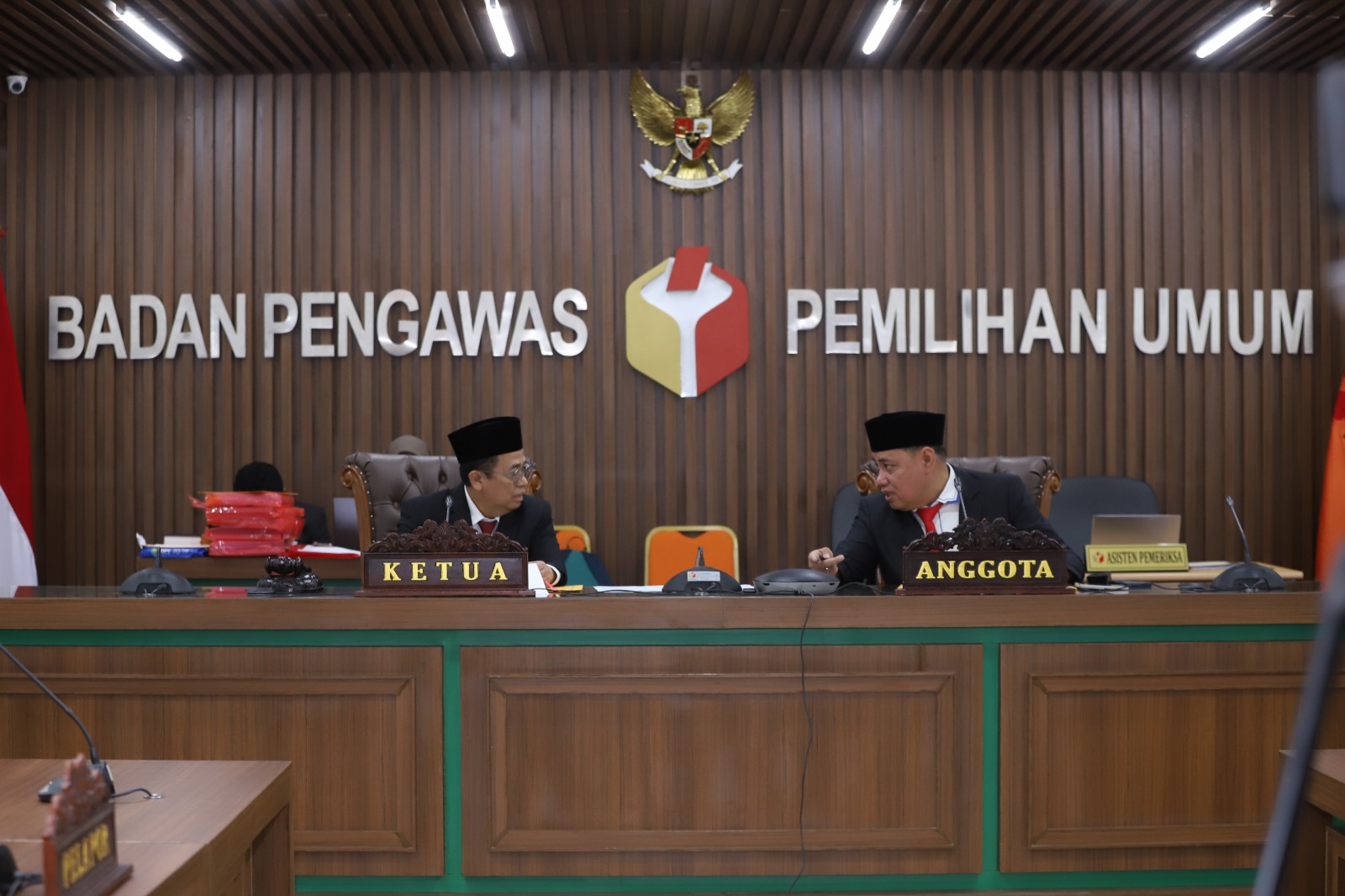 Ketua (Puadi) dan Anggota (Herman Malonda) Majelis Sidang Bawaslu menggelar sidang dugaan pelanggaran administrasi pada Kamis (21/3/2024) di ruang sidang Bawaslu, Jakarta, dengan nomor register 003/LP/ADM.PL/BWSL/00.00/III/2024.