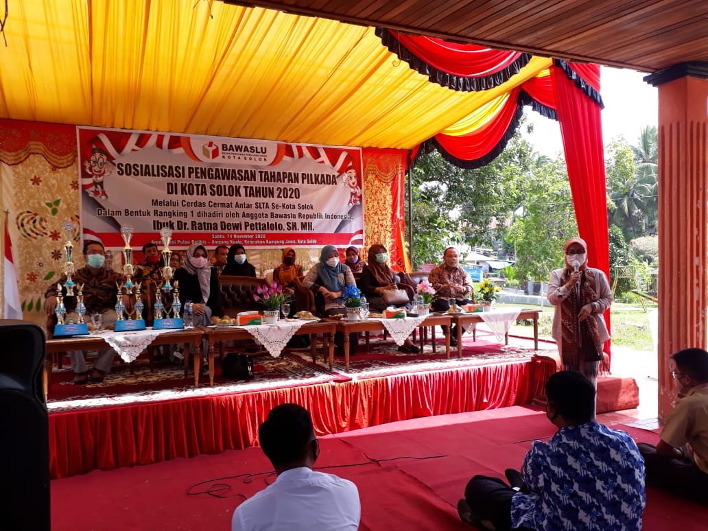 Anggota Bawaslu Ratna Dewi Petalolo menjadi narasumber dalam kegiatan Sosialisasi Pengawasan Tahapan Pilkada yang digelar di Kota Solok Tahun 2020 dengan mengundang para pelajar antar SLTA se-Kota Solok, Sabtu (14/11/2020) / foto : (Humas Bawaslu Provinsi Kota Solok)