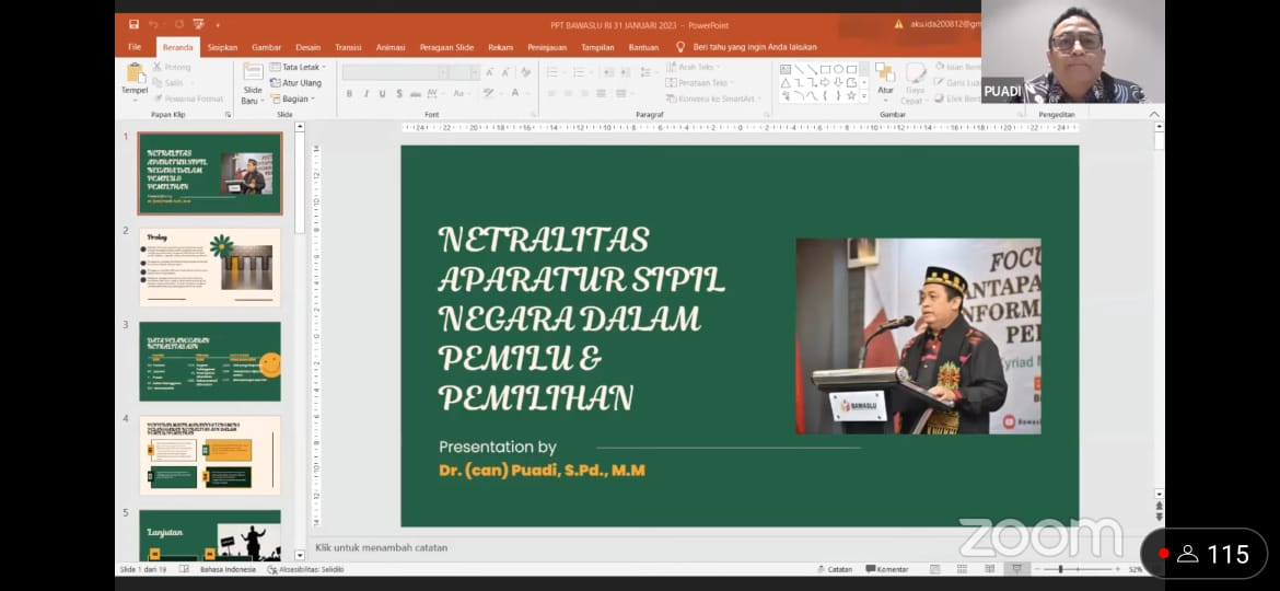 Jakarta, Badan Pengawas Pemilihan Umum- Anggota Bawaslu Puadi mengimbau Aparatur Sipil Negara (ASN) untuk senantiasa menjaga netralitasnya dalam gelaran Pemilu dan Pemilihan Tahun 2024. Dia mengibaratkan hak politik yang dimiliki ASN itu tak ubahnya sebagai aurat politik.