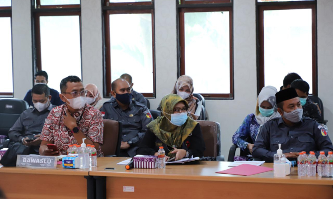 Dari kiri ke kanan; Deputi Administrasi KPU RI Purwoto Ruslan Hidayat, Ketua KPU Kalsel Sarmudji, Wakil Ketua Panja Komisi II Syamsurizal, Ketua Panja Komisi II Saan Mustopa dan Anggota Bawaslu RI Fritz Edward Siregar dalam Kunker Panja Evaluasi Pelaksanaan Pilkada Serentak Tahun 2020 Komisi II DPR RI, di Banjarmasin, Selasa (30/03/2021). Foto: Hendry (Humas Bawasu Kalsel)