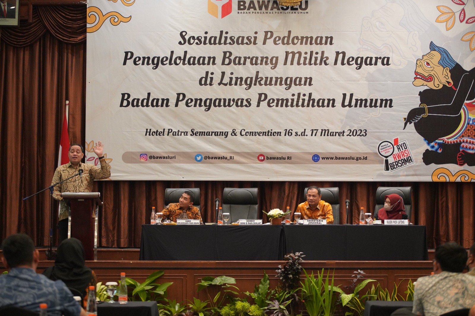Anggota Bawaslu Herwyn JH Malonda saat membuka kegiatan sosialisasi pedoman pengelolaan barang milik negara di lingkungan badan pengawas pemilihan umum, di Semarang Kamis (16/02/2023).