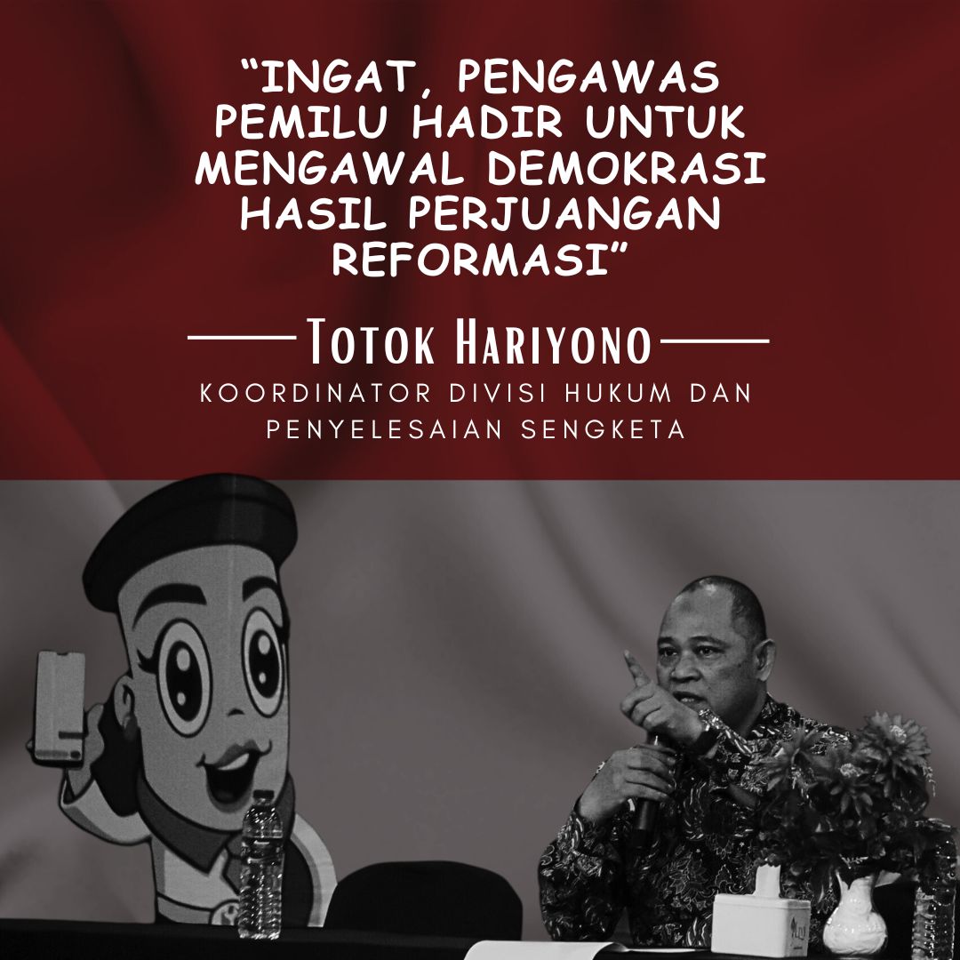 Dalam kerja-kerja pengawasan, Totok menginginkan Anggota Bawaslu Kabupaten/Kota untuk mengawasi dengan adil kepada seluruh peserta pemilu. Tidak ada beda antara partai politik penguasa di daerah dengan partai baru. Pengawasan adalah alat Bawaslu untuk menindak dugaan pelanggaran.