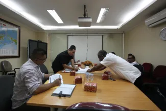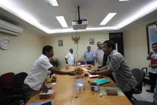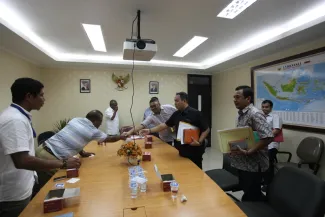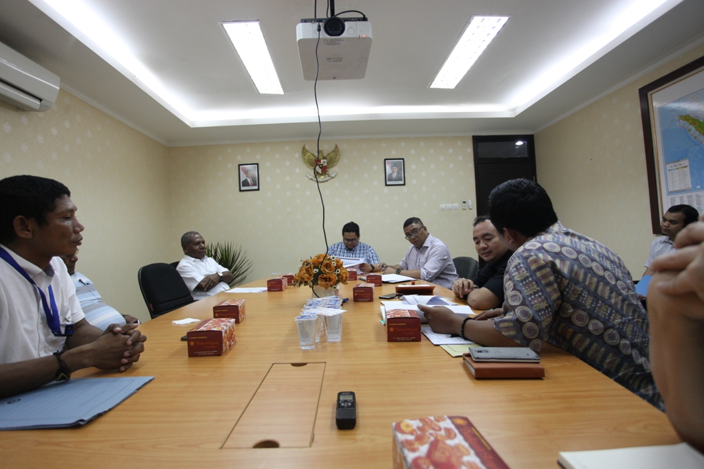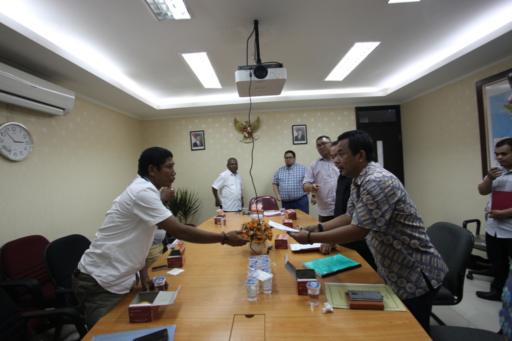 Jakarta, Badan Pengawas Pemilu – Anggota Bawaslu RI Fritz Edward Siregar, Rahmat Bagja, dan Mochamad Afifudin menerima audiensi Bupati Kabupaten Jayapura Mathius Awaitouw di Kantor Bawaslu RI, Senin (24/4). Kehadiran Bupati Kabupaten Jayapura itu terkait persiapan pemungutan suara ulang di 17 distrik di Kabupaten Jayapura.