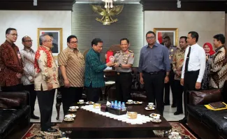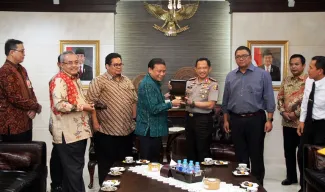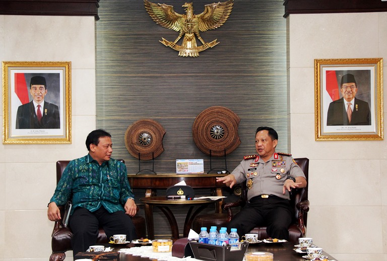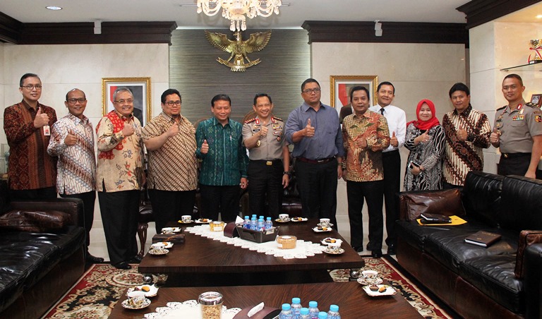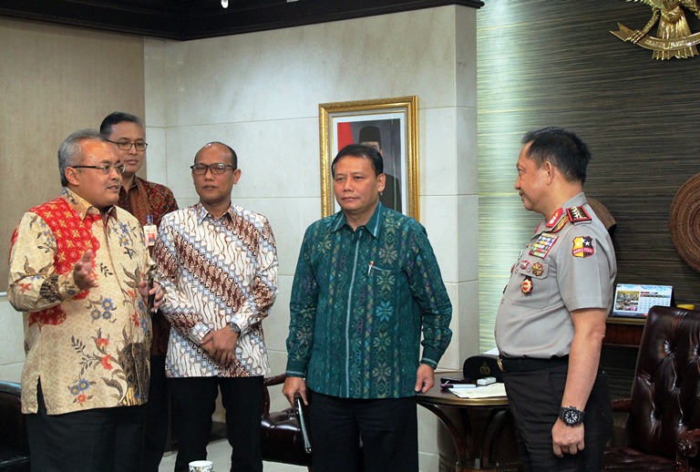 Ketua Bawaslu Abhan, Anggota Bawaslu Rahmat Bagja dan Fritz Edward Siregar, Sekretaris Jenderal Gunawan Suswantoro, dan Kepala Biro TP3 Bernad D. Sutrisno,Kepala Biro H2PI Ferdinand Eskol Tiar Sirait, serta Kepala Biro Administrasi Dermawan Adhi Santoso melakukan audiensi dengan Kapolri Jendral Pol Tito Karnavian di Ruang Utama Mabes Polri, Jl Trunojoyo, Jakarta Selatan, Jumat (5/5). Photo: Humas-Nurisman