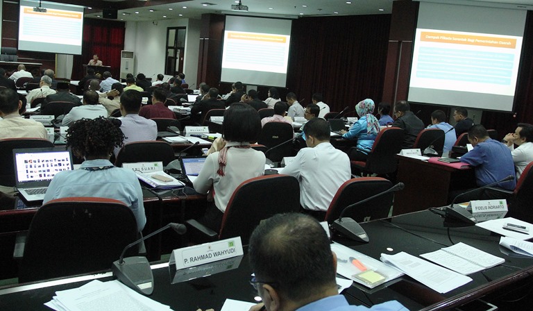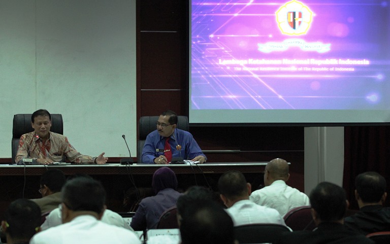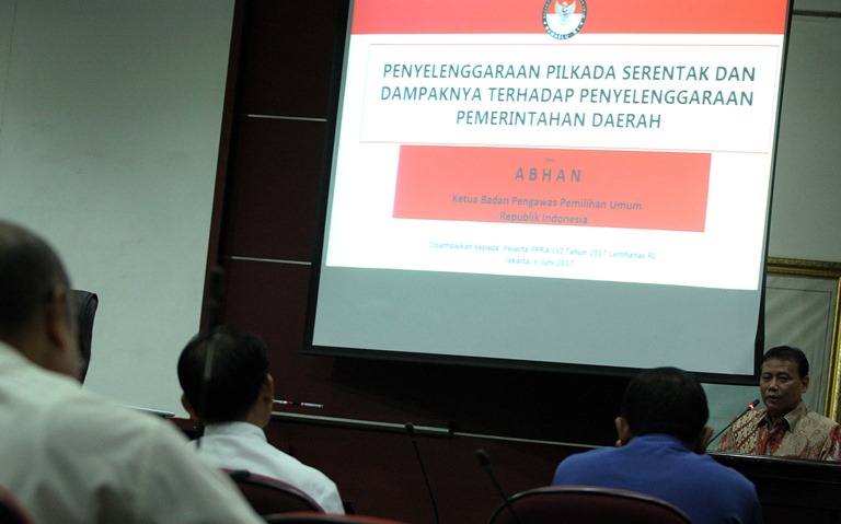 Ketua Bawaslu RI, Abhan memberikan ceramah ilmiah kepada peserta PPRA (Program Pendidikan Reguler Angkatan) LVI tahun 2017 Lemhanas RI tentang penyelenggaraan Pilkada Serentak dan Dampaknya Terhadap Penyelenggaraan Pemerintah Daerah, selasa (6/6) di ruang NKRI gedung Pancagatra Lemhanas RI. PPRA LVI Tahun 2017 ini diikuti sekitar 114 peserta yang berasal dari TNI yang berisikan Angkatan Darat, Angkatan Udara serta Angkatan Laut, Polri, Kementrian, Lembaga Pemerintah Non Kementrian, Kejaksaan Agung, Komnas HAM, Perseroan Terbatas, Kopertis, Organisasi Masyarakat, Tokoh, Partai Politik serta Negara Sahabat. Photo: Humas-Nurisman