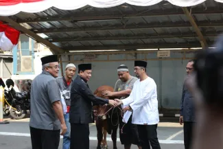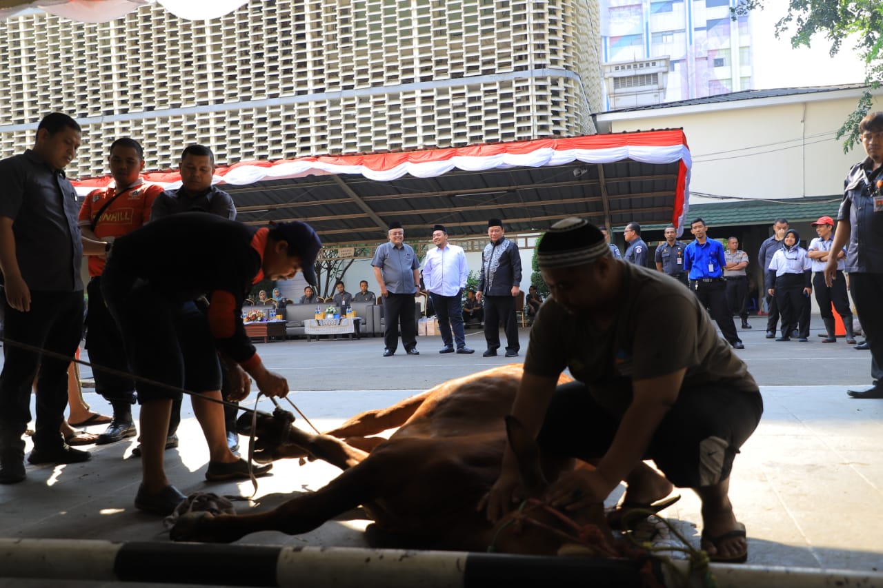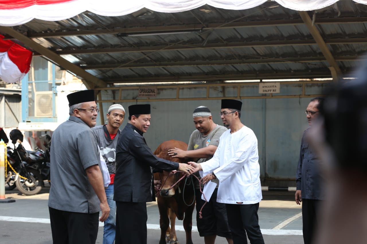 Ketua Bawaslu Abhan menyerahkan hewan qurban kepada panitia qurban untuk disembelih, di Halaman Gedung Bawaslu, Jakarta, Selasa (13/08/2019) Foto: Muhtar