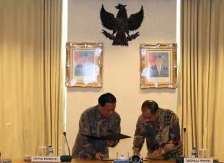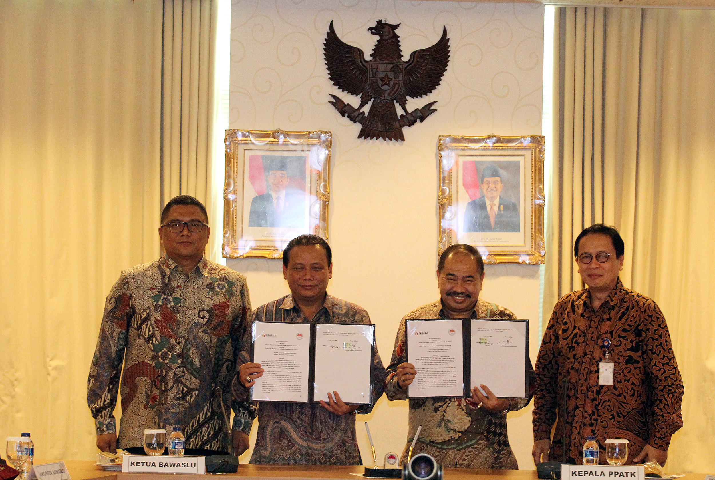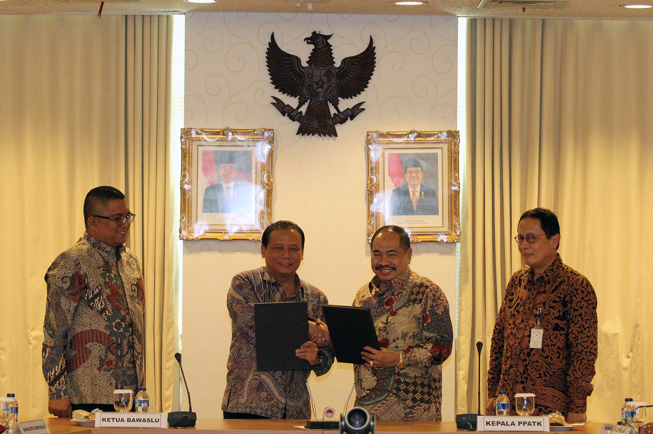 Badan Pengawas Pemilu (Bawaslu) dan Pusat Pelaporan dan Analisis Transaksi Keuangan (PPATK) menandatangani Nota Kesepahaman Bersama (MoU). Penandatangan MoU tersebut dalam rangka kerjasama pencegahan dan pemberantasan tindak pidana pencucian uang (TPPU) serta kerjasama dalam rangka penindakan pelanggaran praktik politik uang dan pengawasan dana kampanye pada penyelenggaraan pilkada dan pemilihan umum. Photo: Humas-Nurisman