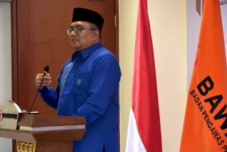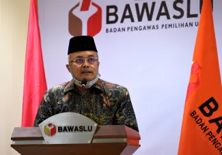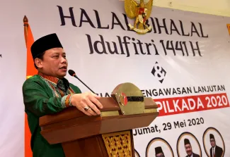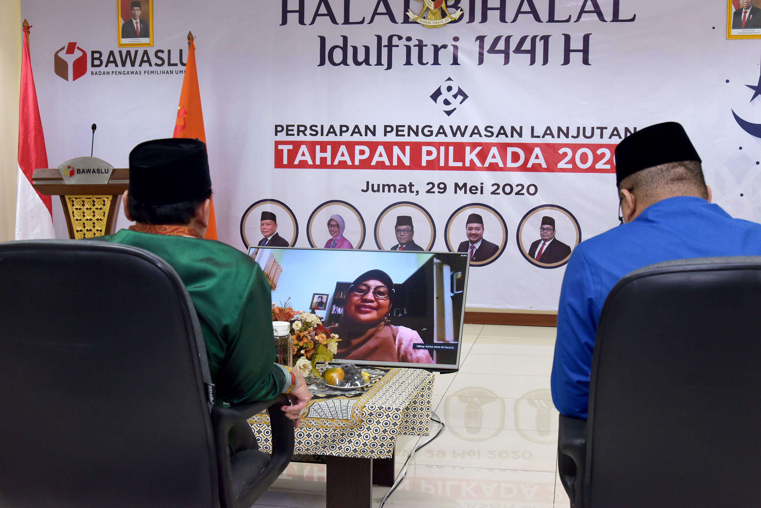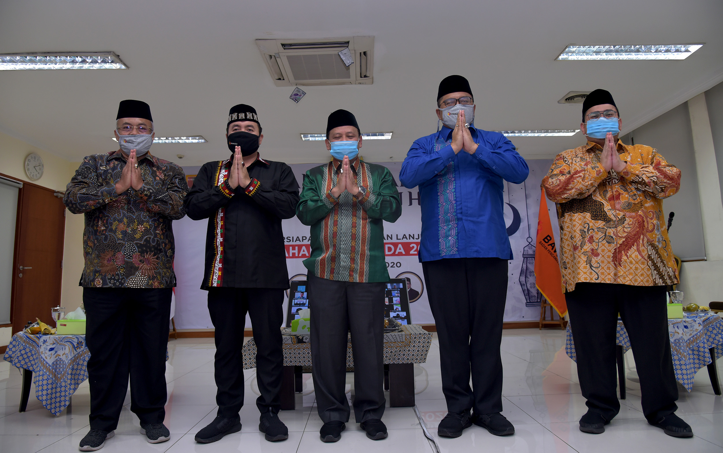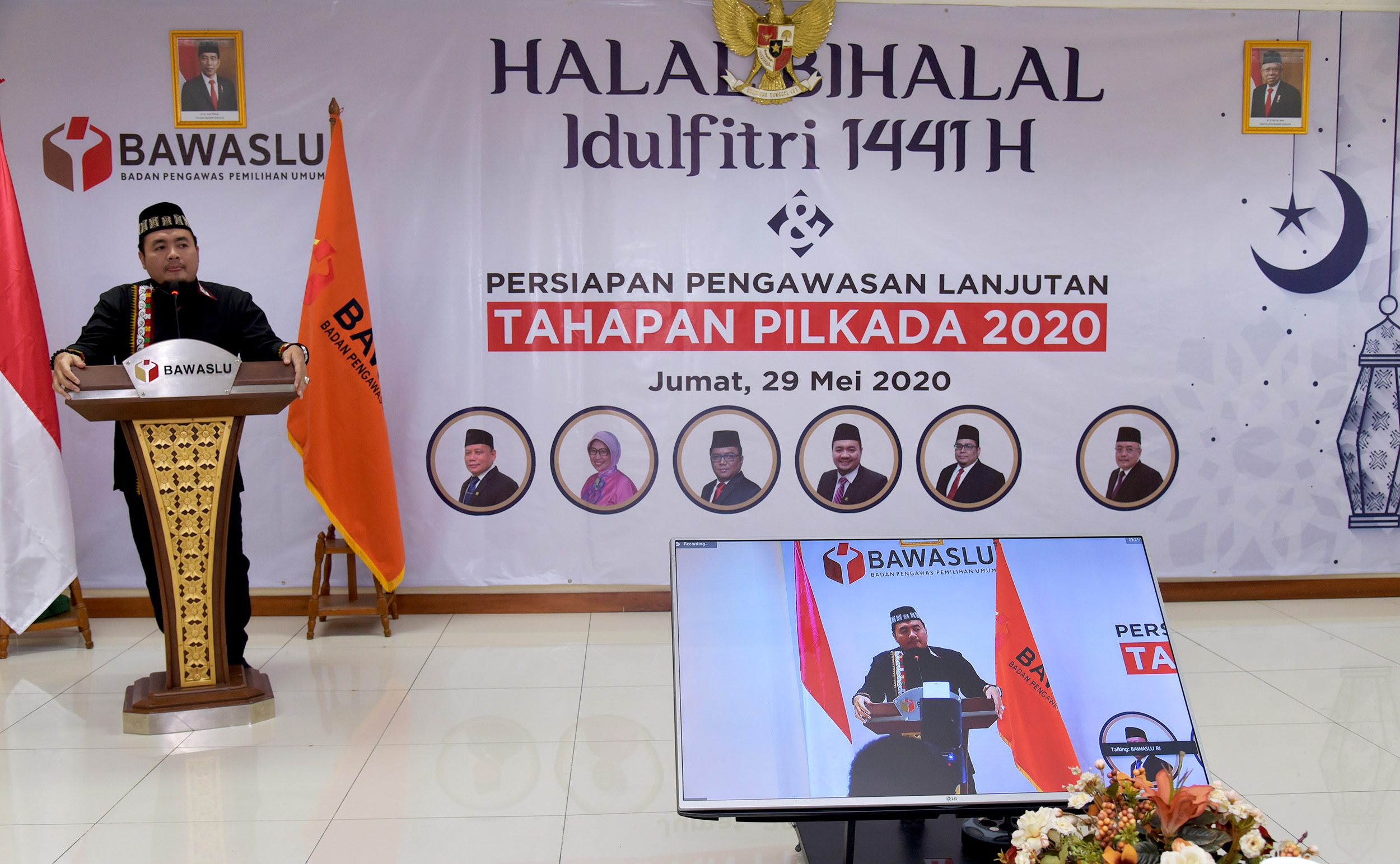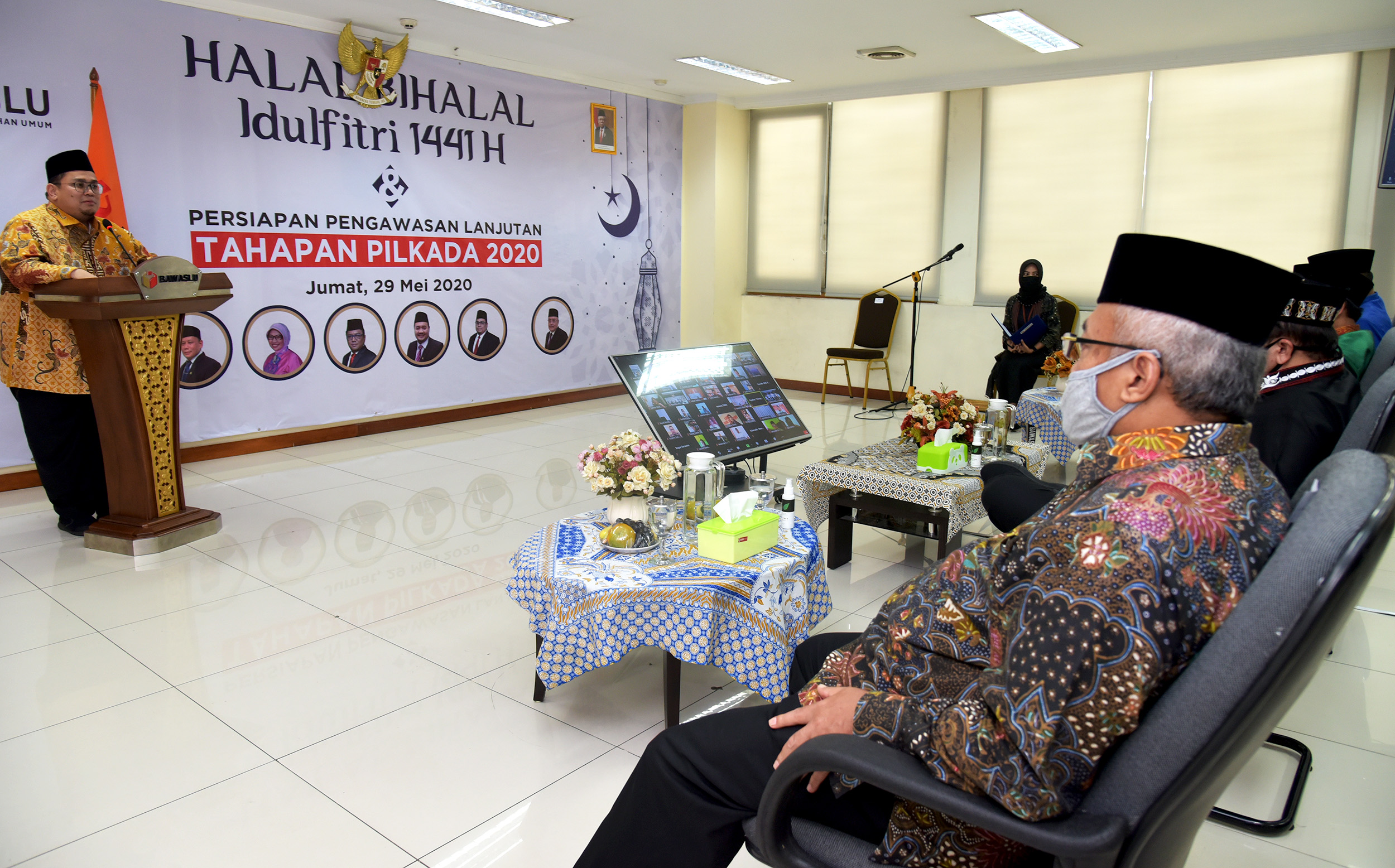Ketua dan Anggota serta Sekretaris Jenderal Badan Pengawas Pemilihan Umum Republik Indonesia menggelar acara Halal Bihalal dengan keluarga besar jajaran pengawas pemilu provinsi se-Indonesia, dengan mengusung tema "Persiapan Pengawasan Lanjutan Tahapan Pilkada 2020", acara Halal bihalal tersebut dilaksanakan di Gedung Bawaslu RI, Jalan MH Thamrin 14, Jakarta Pusat, Jumat (29/5/2020). Ketua Bawaslu, Abhan menyampaikan rasa syukurnya dapat merayakan Idul Fitri tahun ini dengan keluarga besar jajaran pengawas pemilu meskipun dilakukan secara virtual. “Saya berdoa semuanya dalam keadaan sehat dan siap melaksanakan tugas menjeleng pilkada 9 Desember 2020 mendatang," ujar Abhan dalam sambutanya. Photo : HUMAS-Nurisman