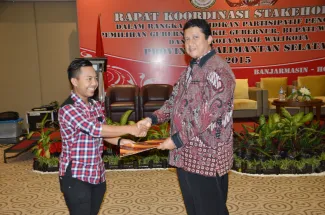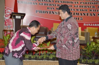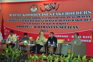 Banjarmasin, Badan Pengawas Pemilu – Badan Pengawas Pemilihan Umum  (Bawaslu) Republik Indonesia dan Bawaslu Provinsi Kalimantan Selatan menggelar Rapat Koordinasi Stakeholders dalam rangka Pendidikan Partisipatif Pengawasan Pemilihan Gubernur, Bupati dan Walikota Provinsi Kalimantan Selatan Tahun 2015. Kegiatan ini diselenggarakan mulai Senin (5/10) sampai dengan Rabu (7/10) di Hotel Rattan Inn, Banjarmasin.