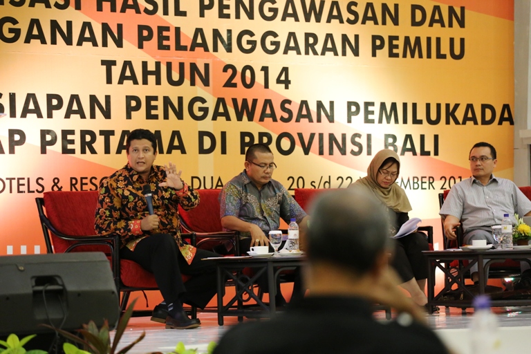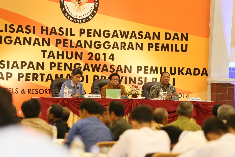 Bali, Badan Pengawas Pemilu – Badan Pengawas Pemilu menggelar Sosialisasi hasil Pengawasan dan Penanganan Pelanggaran Pemilu Tahun 2014, Serta Persiapan Pengawasan Pemilu Kada Tahap Pertama di Provinsi Bali, Jumat (21/11). Kegiatan tersebut digelar bertujuan untuk meningkatkan kualitas pengawasan bagi penyelenggara dan partisipasi masyarakat dalam kesiapan menghadapi Pemilu Kepala Daerah tahun 2015.