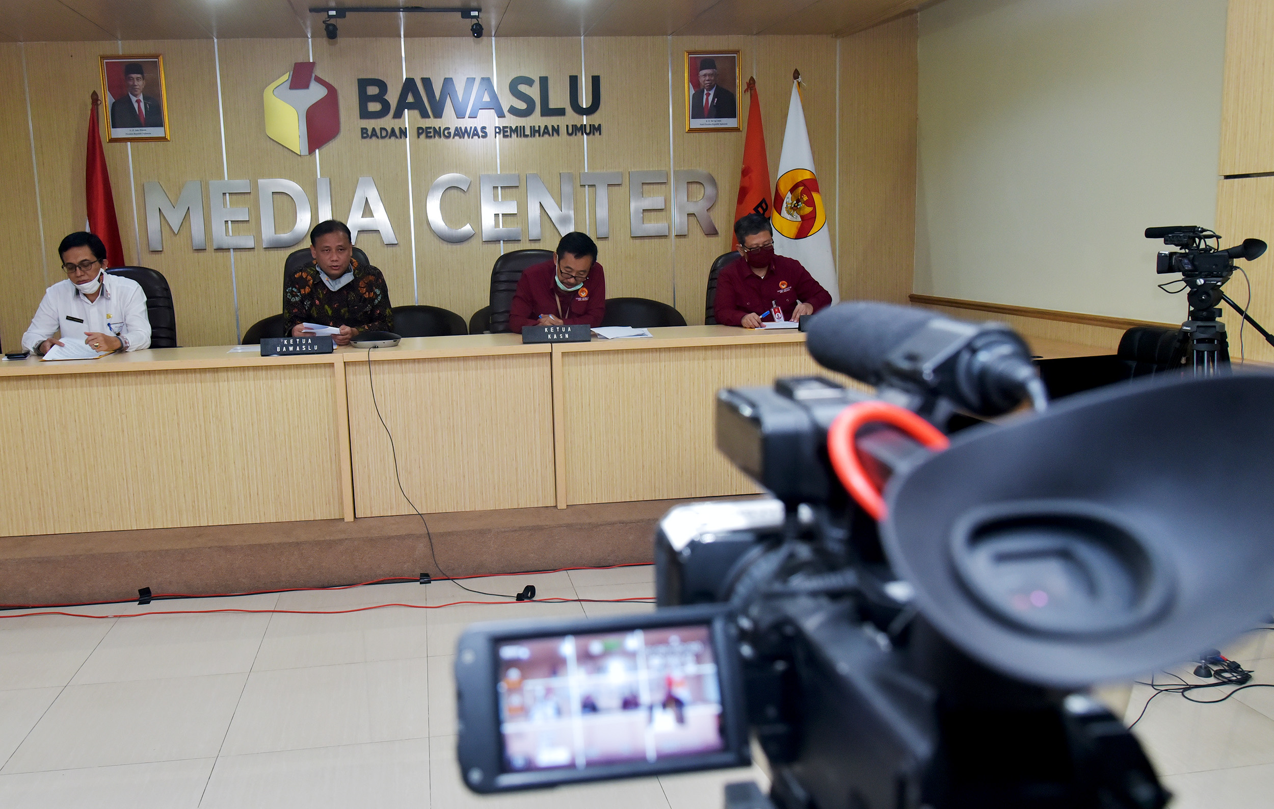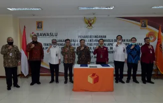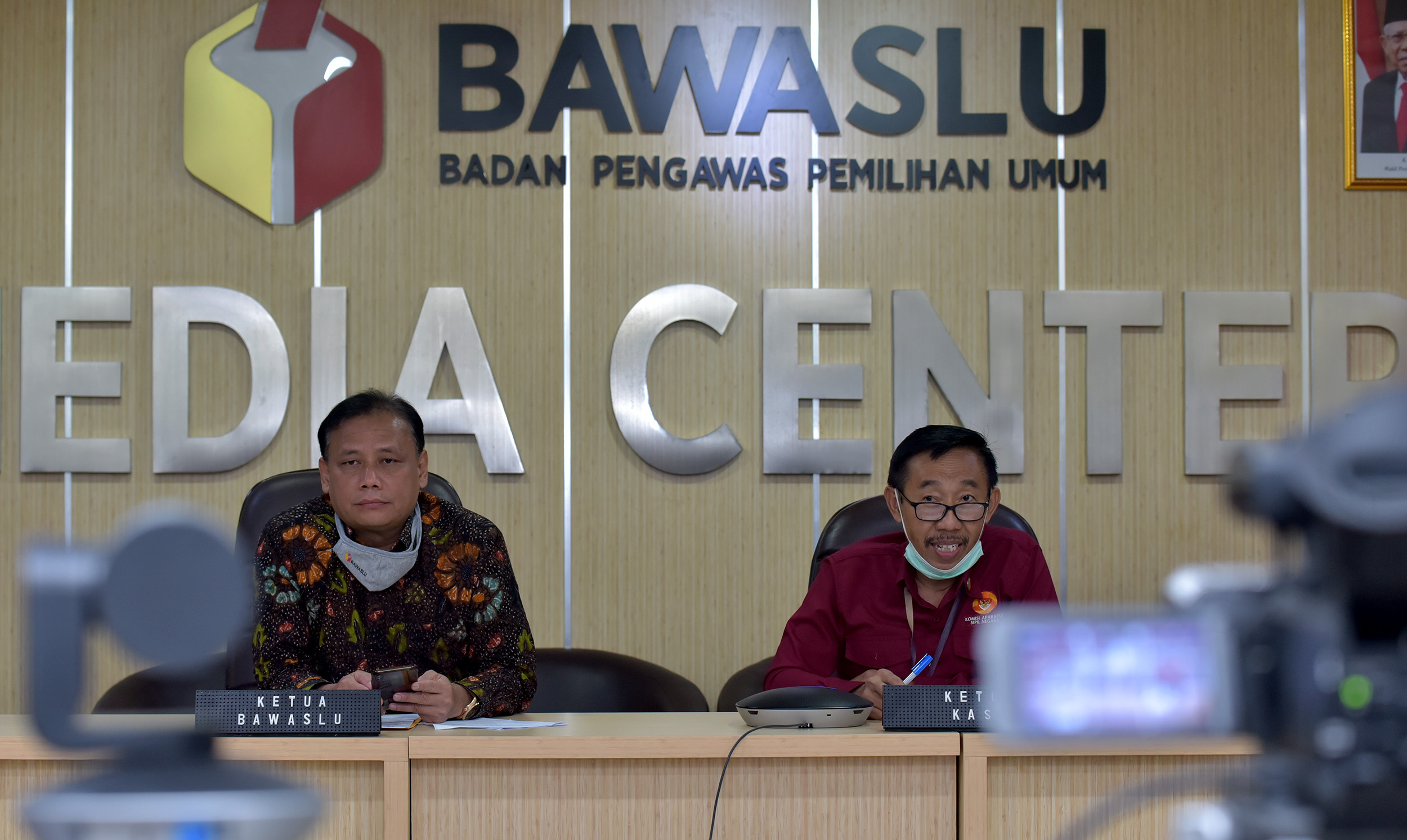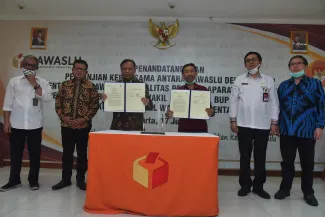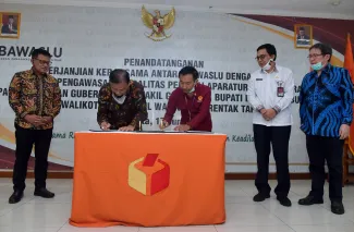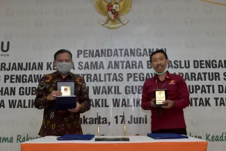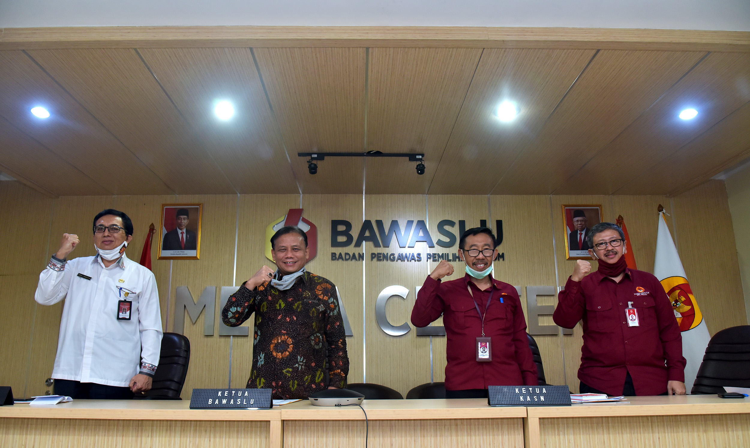 Ketua Bawaslu Abhan bersama Ketua KASN Agus Pramusinto menandatangani PKS (Perjanjian Kerja Sama), di Kantor Bawaslu Jl MH.Thamrin Jakarta, Rabu (17/6/2020).Bawaslu melanjutkan kerjasama dengan Komisi Aparatur Sipil Negara (KASN) untuk mencegah dan mengawasi netralitas ASN pada Pilkada 2020. Prosesi penandatanganan PKS dengan menerapkan standar protokol kesehatan covid-19 ini disaksikan oleh Inspektorat Jenderal Kementerian Dalam Negeri (Kemendagri) Tumpak Haposan Simanjuntak, Koordinator Fokus 3 (Penegakan Hukum dan Reformasi Birokrasi) STRANAS Pencegahan Korupsi Audy Wuisang, hadir pula Sekretaris Kementerian Pendayagunaan Aparatur Negara dan Reformasi Birokrasi (Kementerian PANRB) Dwi Wahyu Atmaji serta perwakilan dari Badan Kepegawaian Negara (BKN). Photo : HUMAS-Nurisman