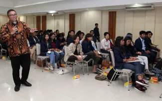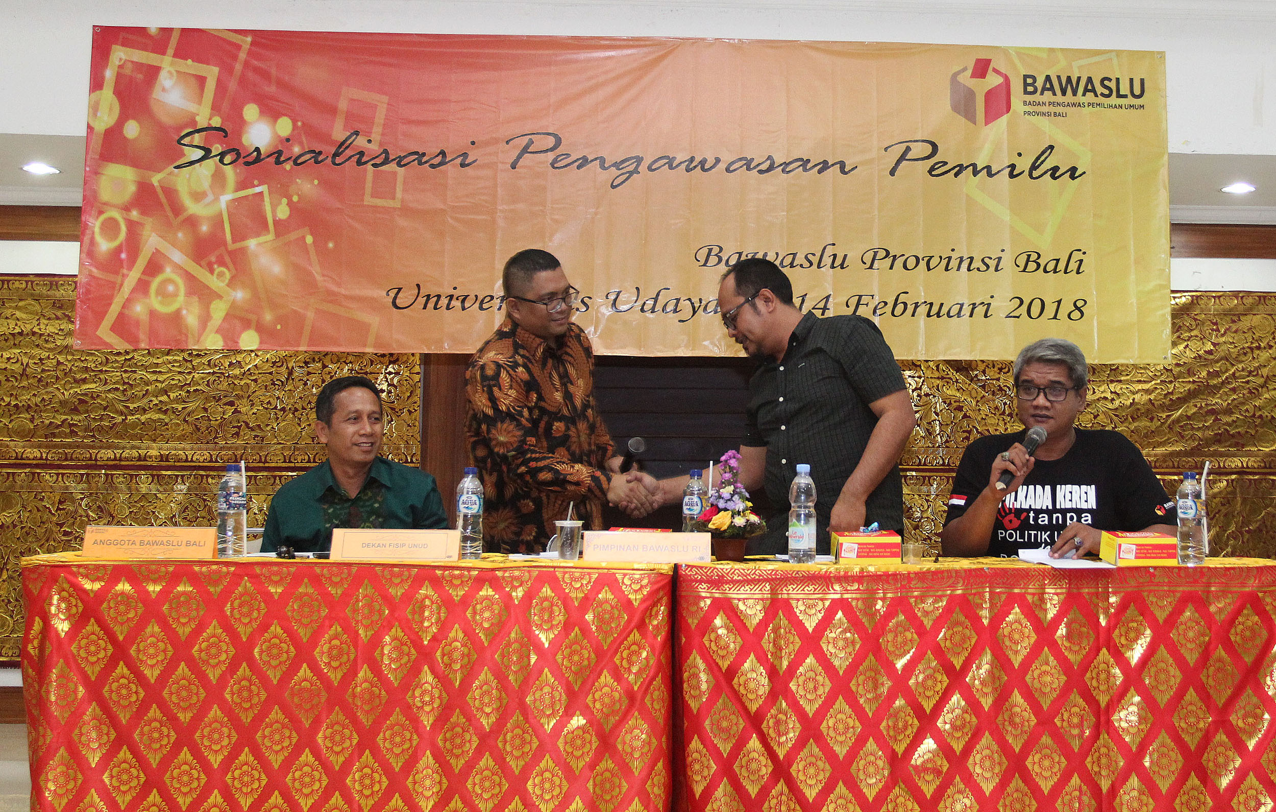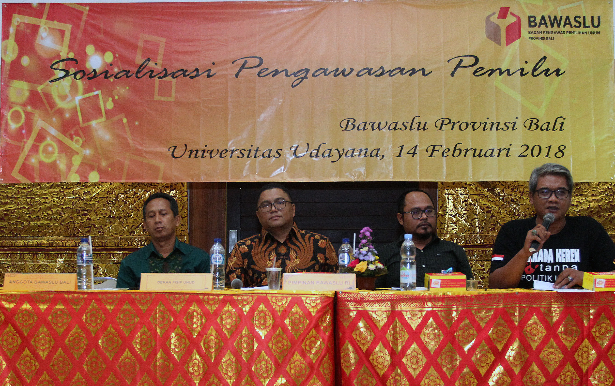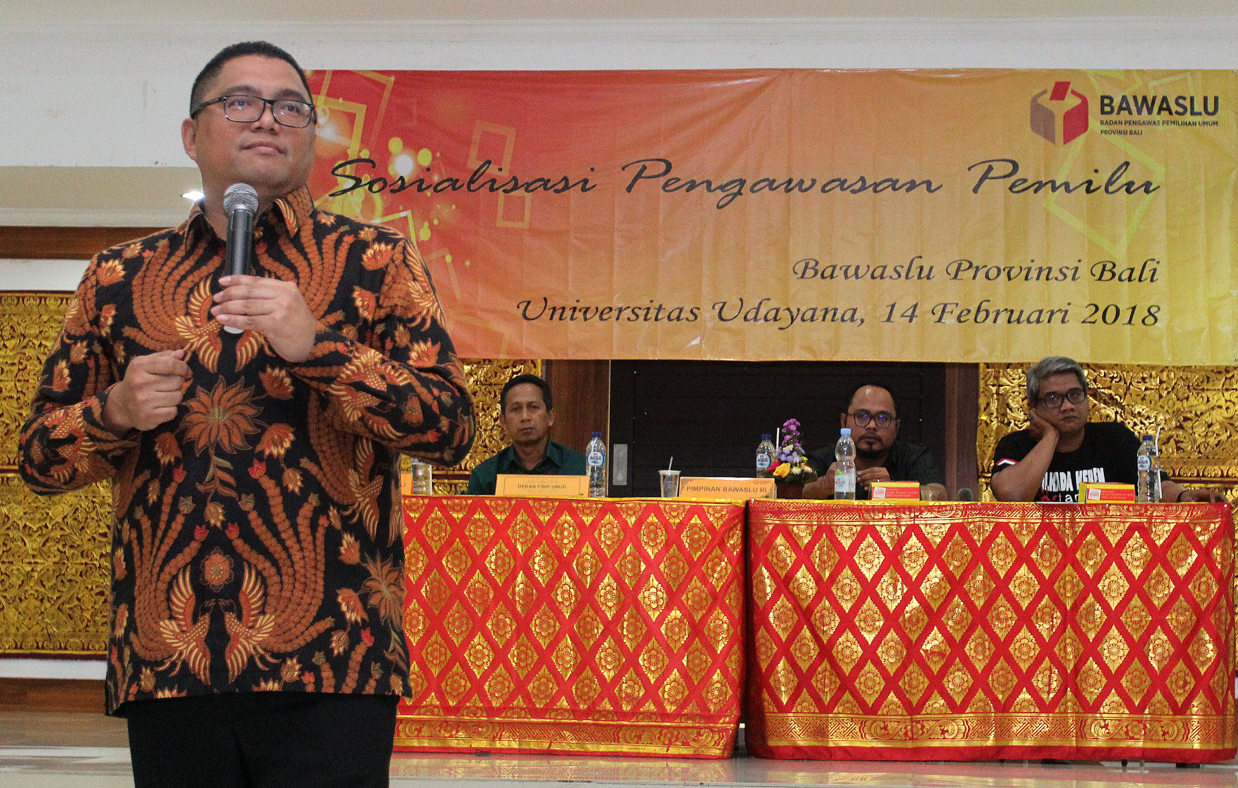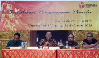 Menghadapi Pilkada Serentak Tahun 2018 serta Pilpres Tahun 2019, Bawaslu Provinsi Bali gelar kegiatan seminar Sosialisasi Pengawasan Pemilu Partisipatif di Gedung Pasca Sarjana Fisipol Universitas Udayana Bali. Anggota Bawaslu RI, Fritz Edward Siregar sebagai nara sumber dalam diskusi tersebut meminta mahasiswa tidak buta politik, mahasiswa semestinya menjadi garda terdepan berperan dan terlibat menjadi relawan pengawasan dalam pelaksanaan Pilkada serentak 2018 dan Pilpres Tahun 2019 nanti, sekitar 100 orang mahasiswa fisipol Universitas Udayana hadir dalam seminar tersebut. Photo: Humas-Nurisman