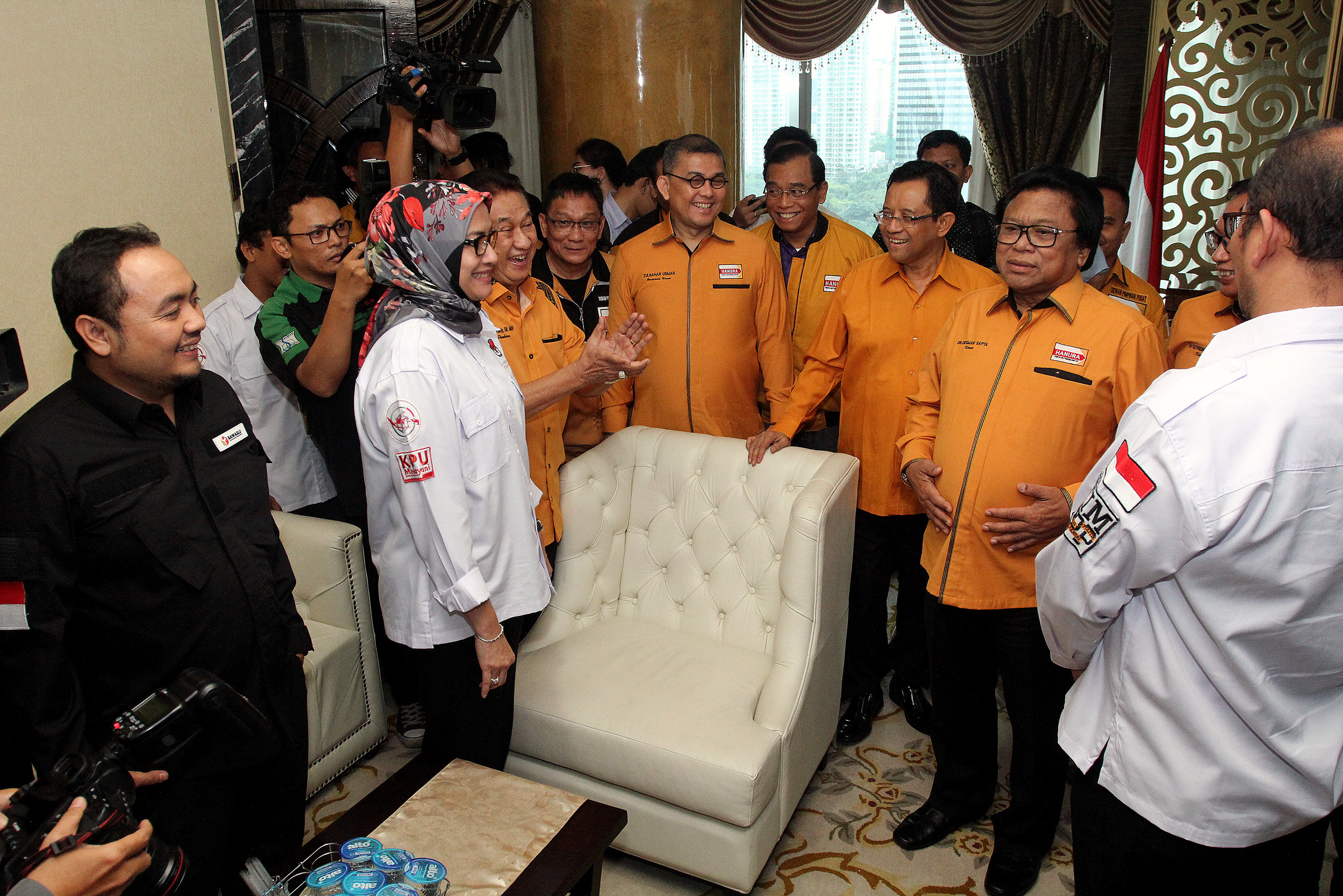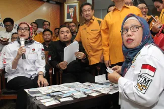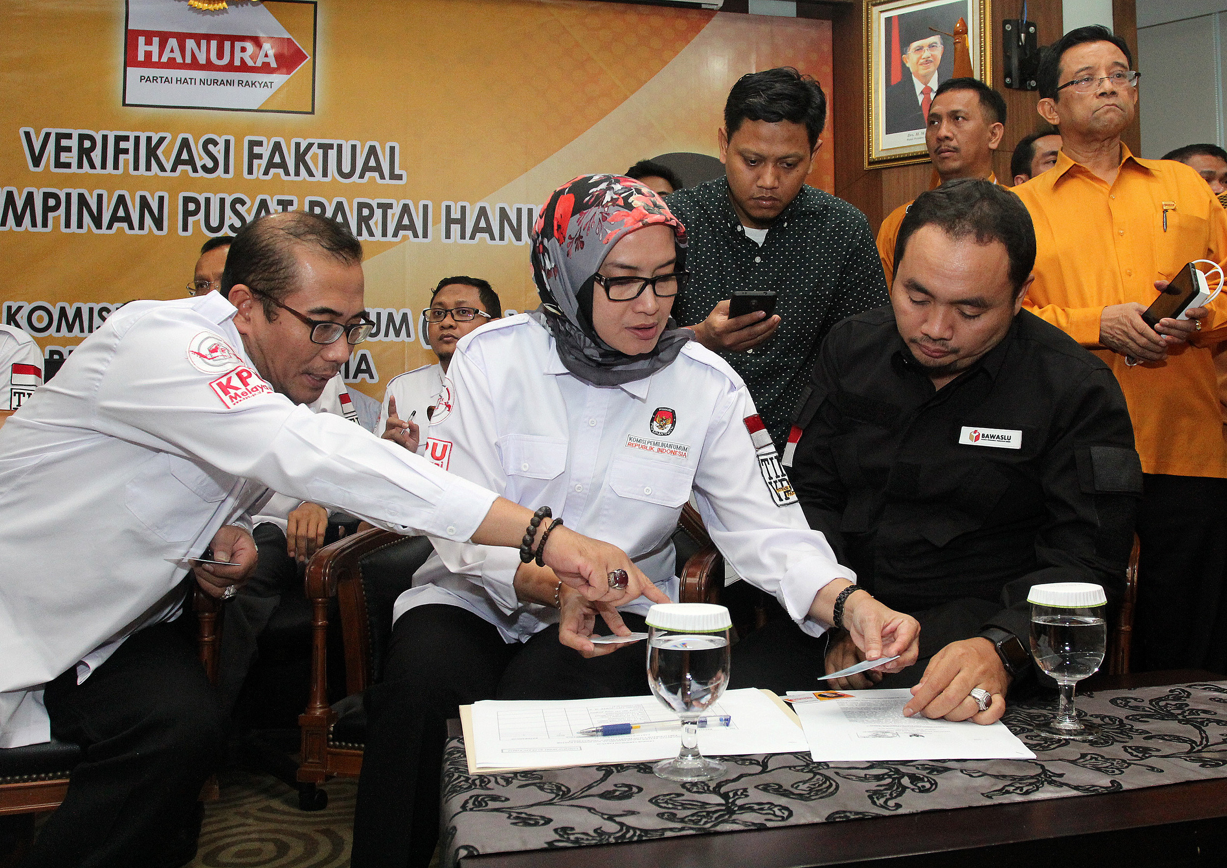 Anggota Bawaslu RI, Mochammad Afifuddin melakukan pengecekan Kartu Tanda Penduduk (KTP) dan Kartu Tanda Anggota (KTA) Ketua Umum Partai HANURA Oesman Sapta yang akrab dipanggil OSO di Kantor DPP HANURA di Gedung City Tower lantai 18, Jl MH Thamrin Nomor 81, Menteng, Jakarta Pusat, Minggu, (28/01/2018). Bawaslu RI bersama KPU RI melakukan verifikasi Faktual terhadap partai politik sebagai calon peserta pemilu Tahun 2019 terkait putusan Mahkamah Konstitusi (MK) soal verifikasi faktual. Berdasarkan Peraturan KPU Nomor 5 Tahun 2018 tentang tahapan, program dan Jadwal penyelenggaraan Pemilu 2019, proses verifikasi faktual tingkat pusat akan berlangsung selama tiga hari dari Tanggal 28. s.d. 30 Januari 2018. Photo: Humas-Nurisman