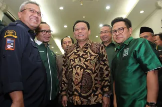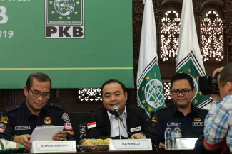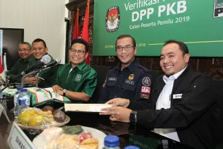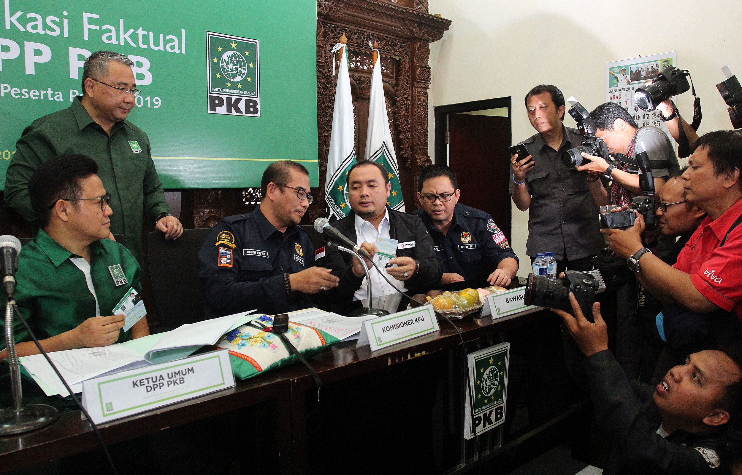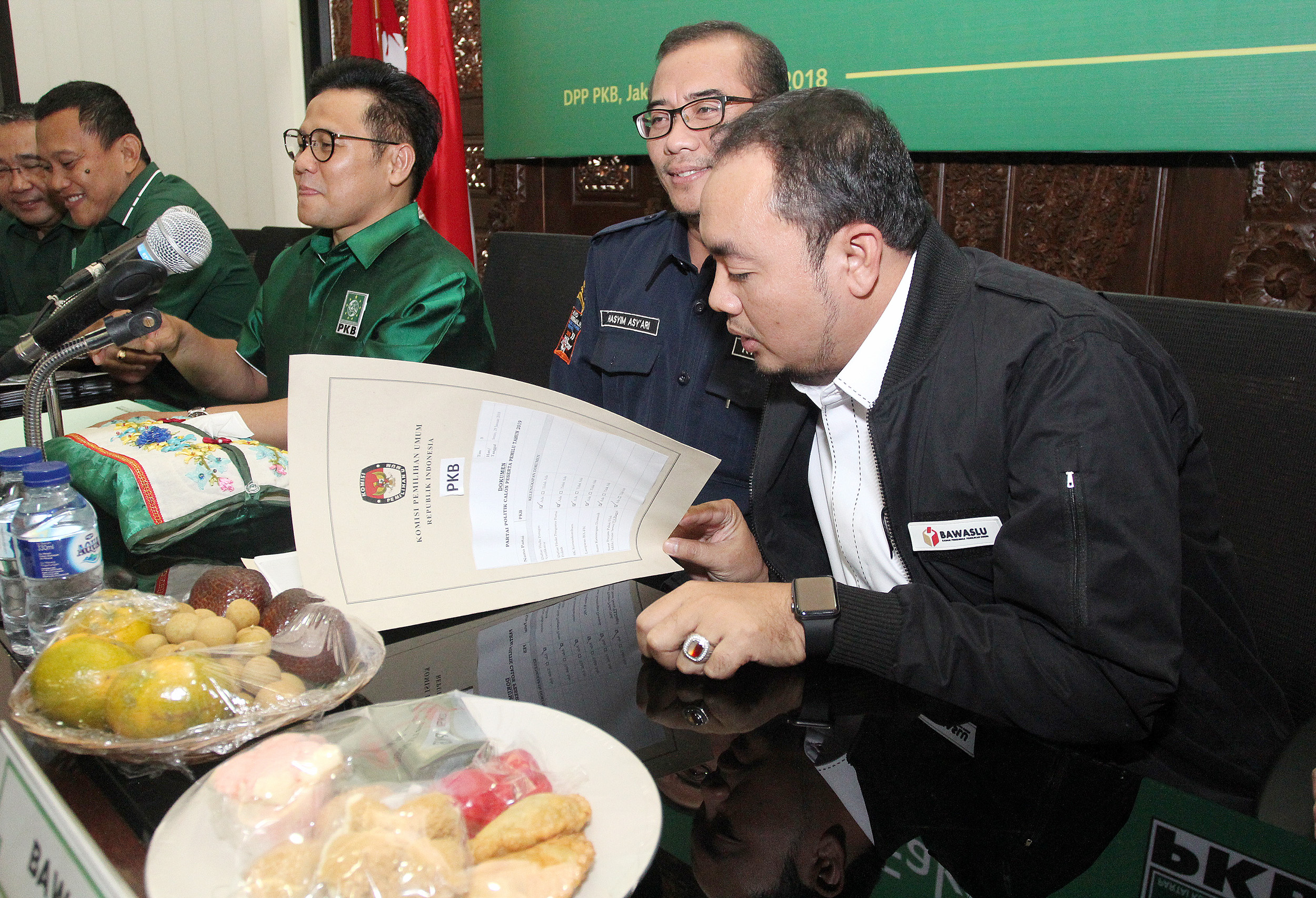 Anggota Bawaslu RI, Mochammad Afifuddin melakukan pengecekan Kartu Tanda Penduduk (KTP) dan Kartu Tanda Anggota (KTA) Ketua Umum Partai Kebangkitan Bangsa (PKB) Muhaimin Iskandar di Kantor DPP PKB Jl Raya Raden Saleh, Jakarta Pusat, Senin, (29/01/2018). Bawaslu RI bersama KPU RI melakukan verifikasi Faktual terhadap partai politik sebagai calon peserta pemilu Tahun 2019 terkait putusan Mahkamah Konstitusi (MK) soal verifikasi faktual. Photo: Humas-Nurisman