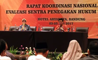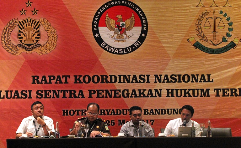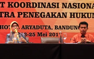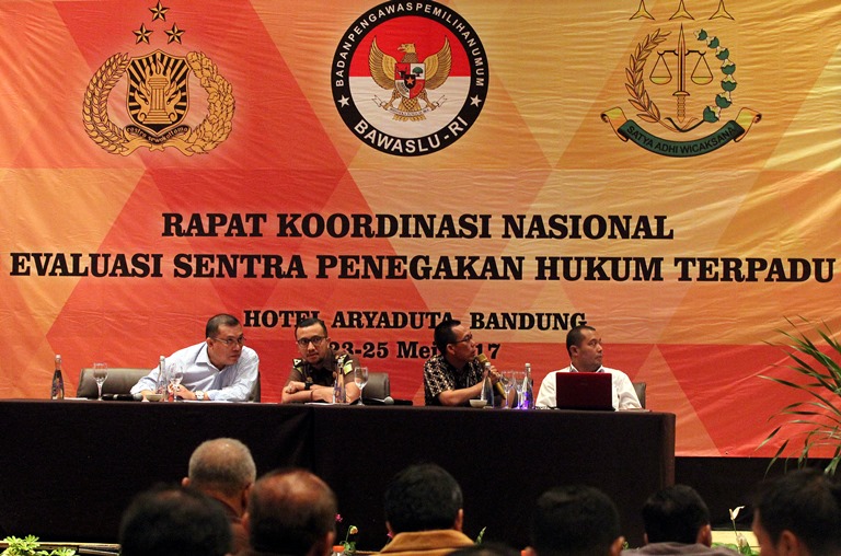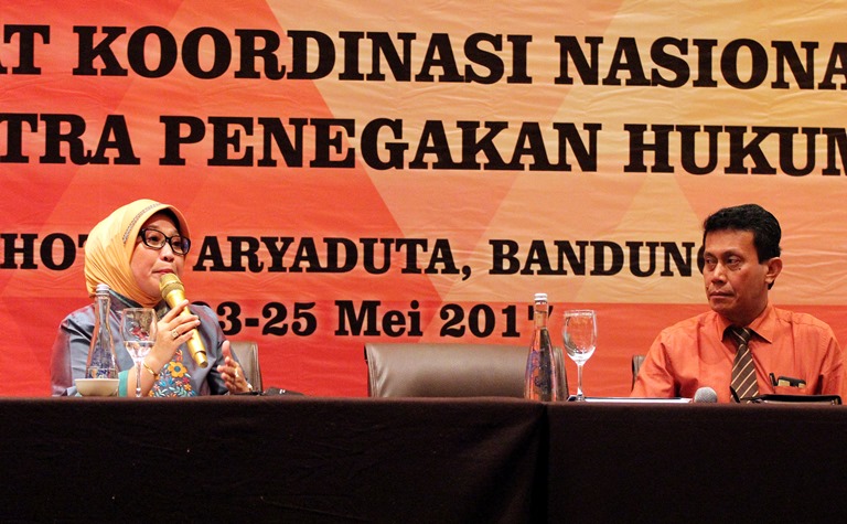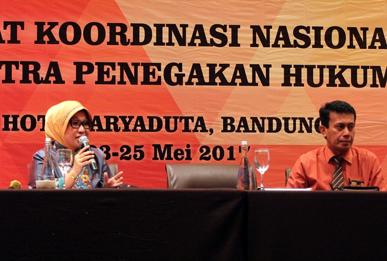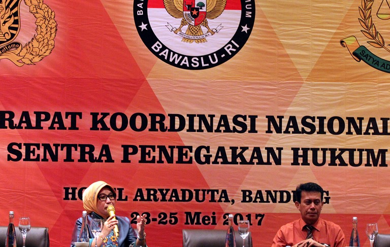 Anggota Bawaslu RI, Ratna Dewi Pettalolo selaku Koordinator Divisi  Penindakan yang juga Pembina Sentra Gakkumdu Pusat menjadi narasumber dalam Rakornas Evaluasi Sentra Gakkumdu di Hotel Aryaduta Bandung, Jawa Barat, Rabu (24/5) dalam rangka persiapan menyukseskan Pilkada Serentak 2018 dan Pemilu Serentak 2019 mendatang. Dalam kegiatan yang di selenggarakan oleh Biro TP3 bagian Temuan dan Laporan Pelanggaran (TLP) Bawaslu RI tersebut juga diadakan sharing dan diskusi pengalaman kasus penanganan pelanggaran tindak pidana pemilu di beberapa daerah. Photo: Humas-Nurisman