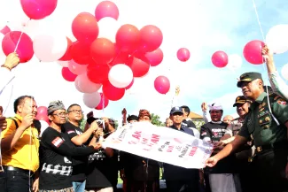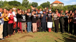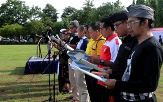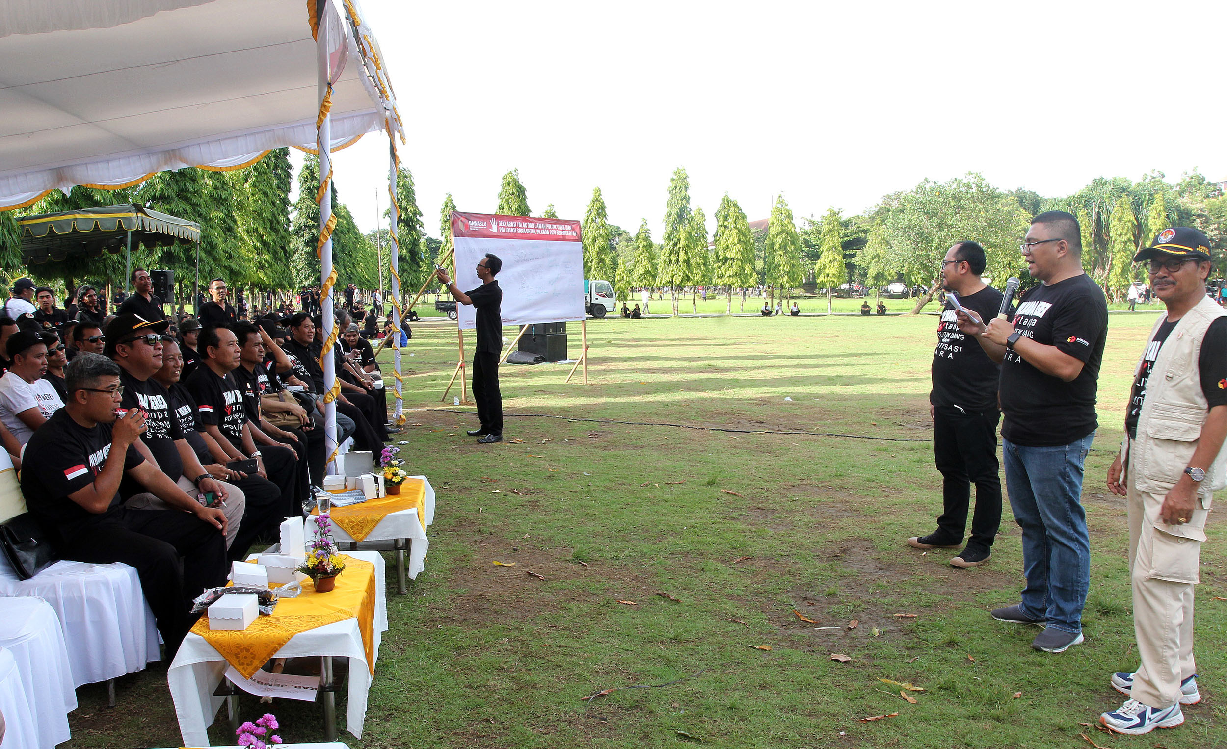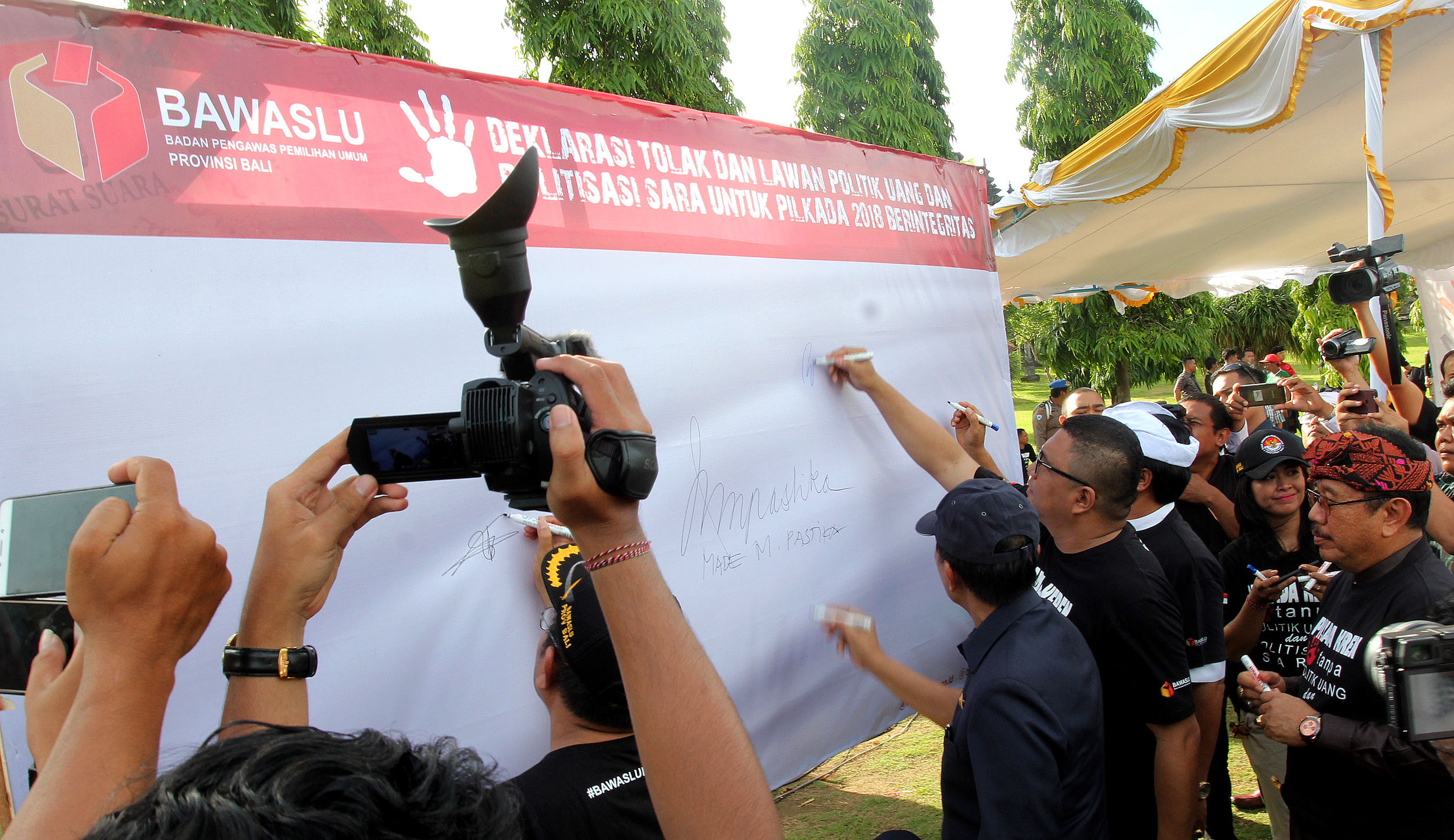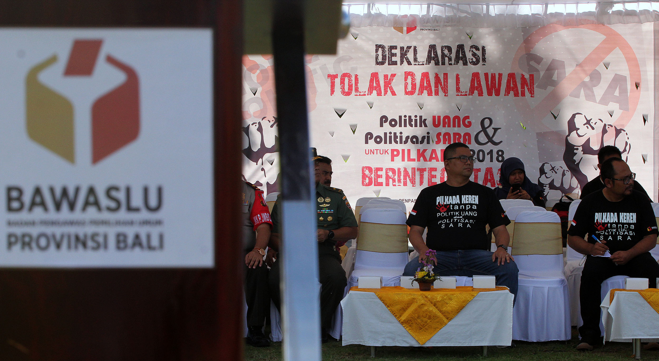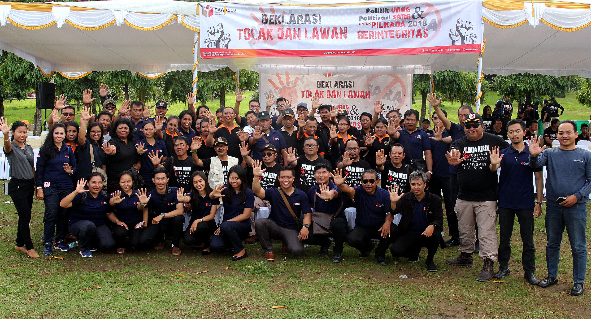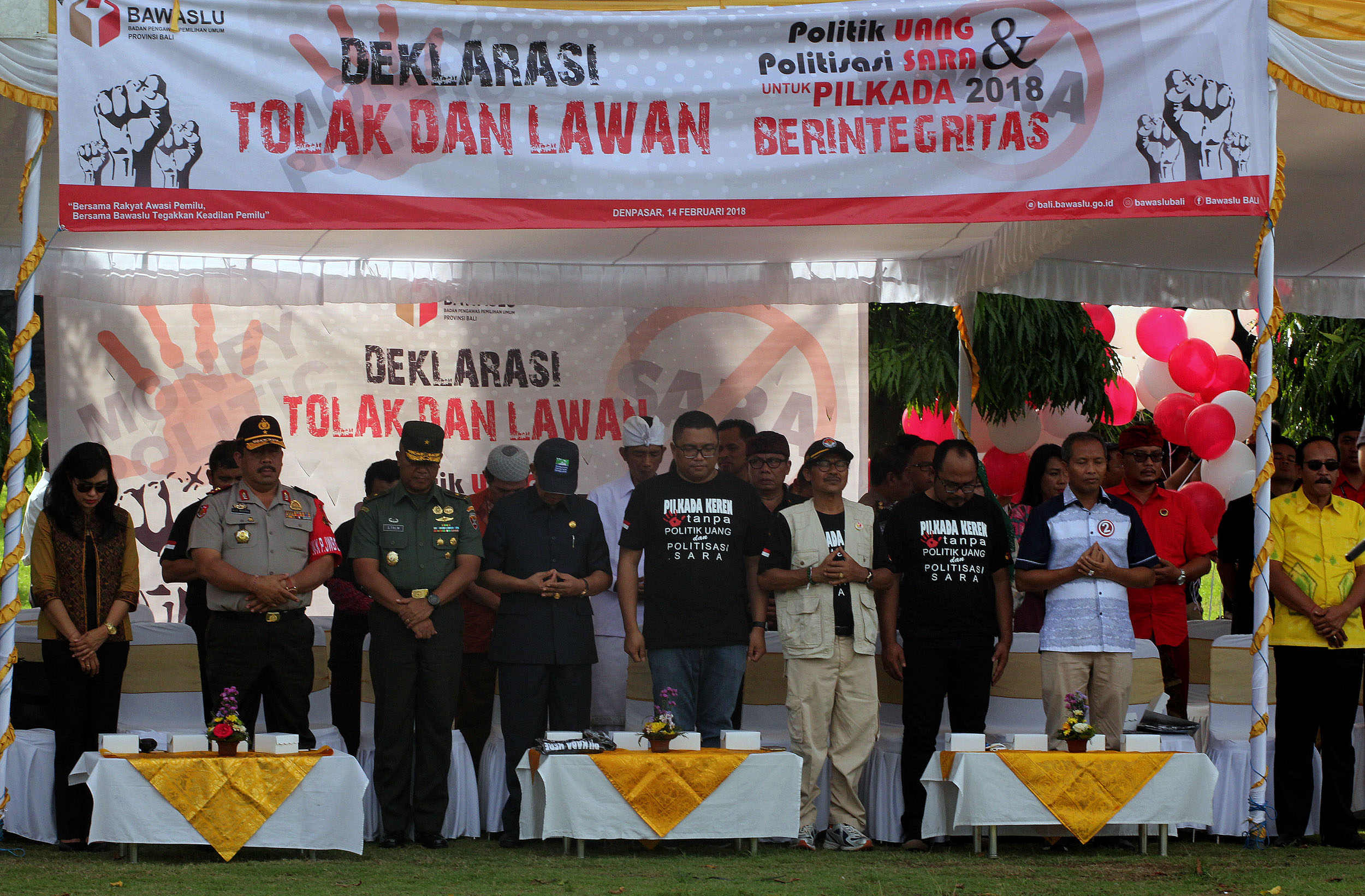 Bertempat di lapangan Timur Bajra Sandhi Niti Mandala Renon, Denpasar Timur, Bawaslu Provinsi Bali menggelar apel deklarasi tolak dan lawan politik uang dan politisasi SARA Pilkada Tahun 2018, Rabu (14/2/2018). Apel deklarasi yang diikuti oleh ratusan anggota Panwaslu Kabupaten dan Kota se-Bali dihadiri oleh Anggota Bawaslu RI, Fritz Edward Siregar, Gubernur Bali Made Mangku Pastika, Wakapolda Bali, Brigjen Pol I Gede Alit Widana, Kasdam IX Udayana Brigjen TNI Stepahanus Tri Mulyono, Kepala Ombudsman perwakilan Bali, Komisioner KPU Provinsi Bali Ni Wayan Widhiastini, kedua pasangan calon serta tim kampanyenya. Photo: Humas-Nurisman