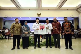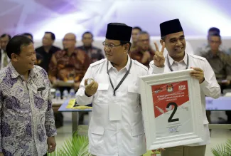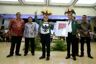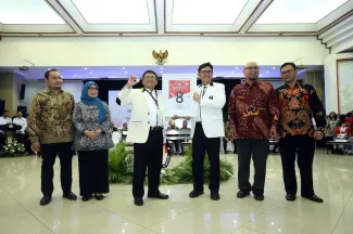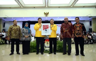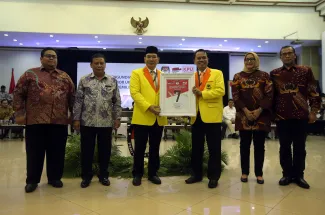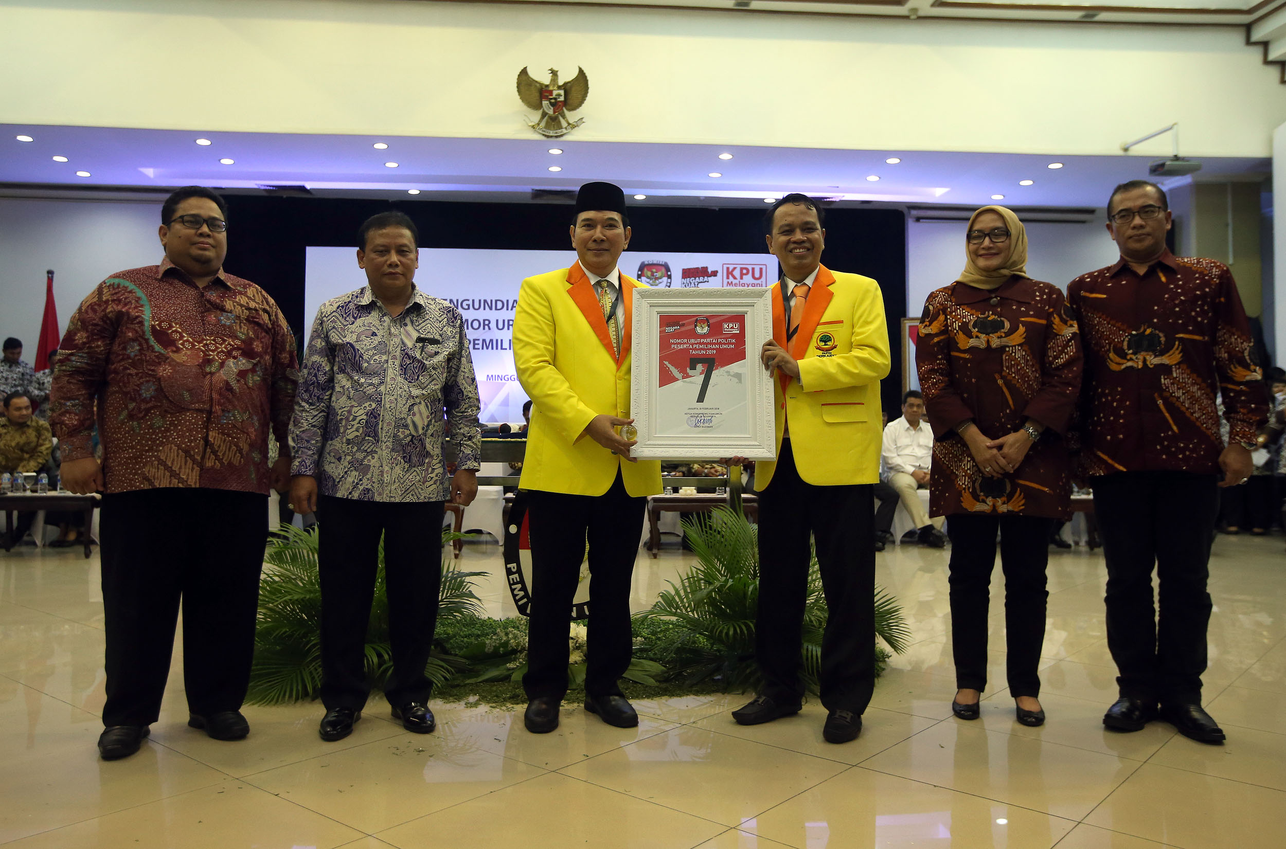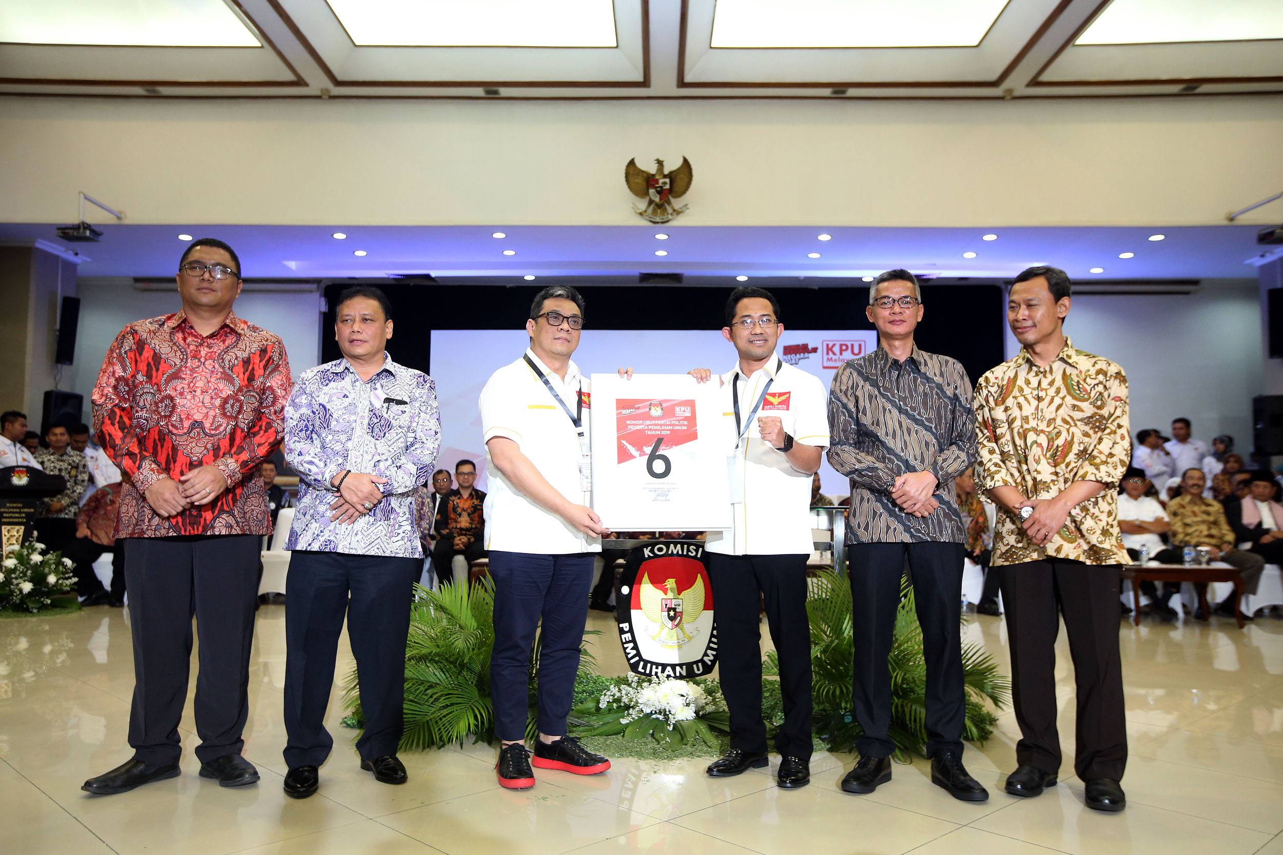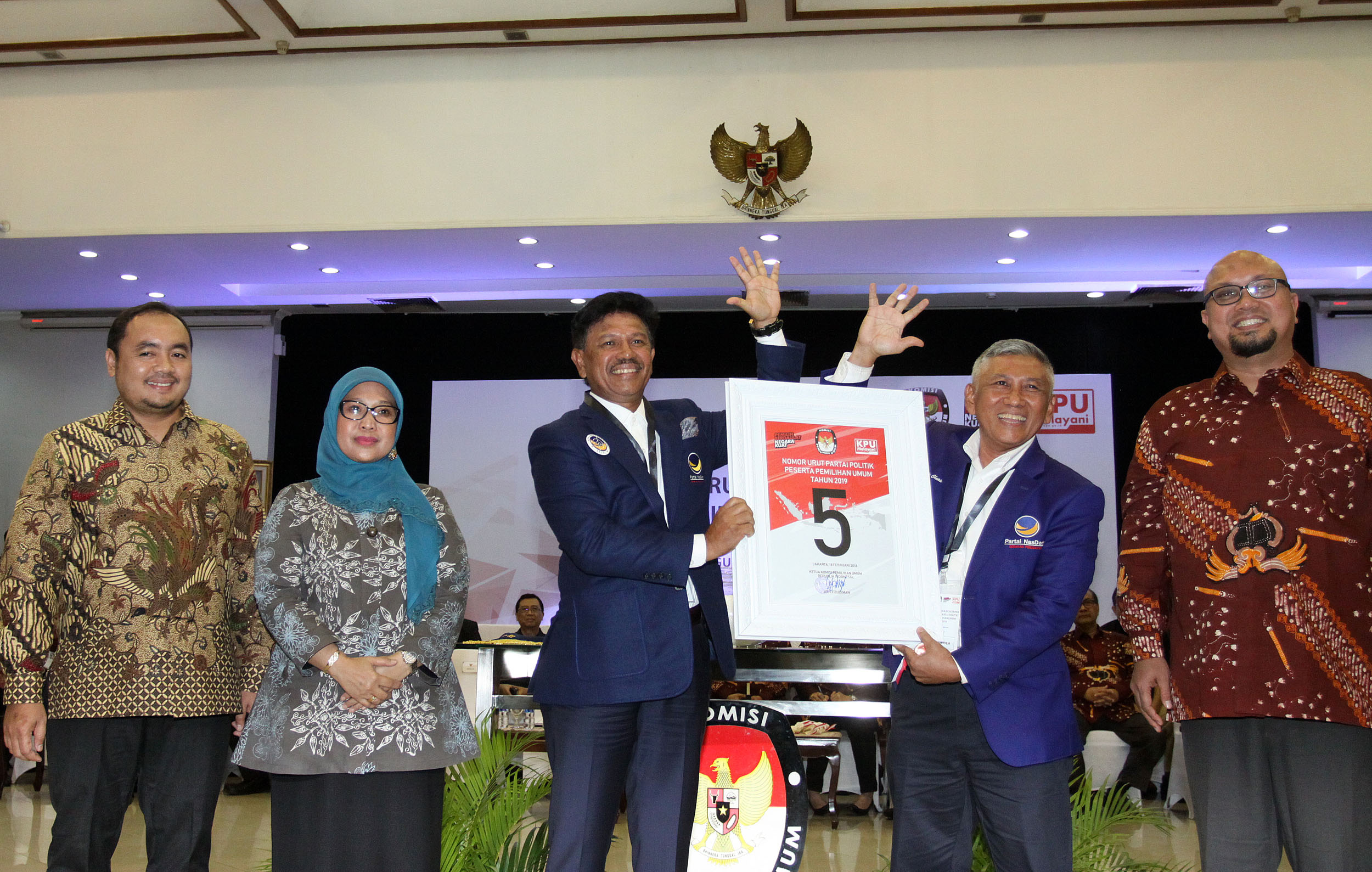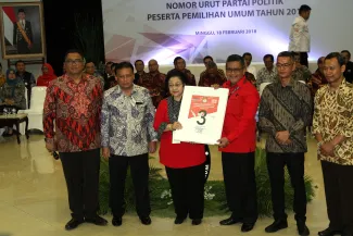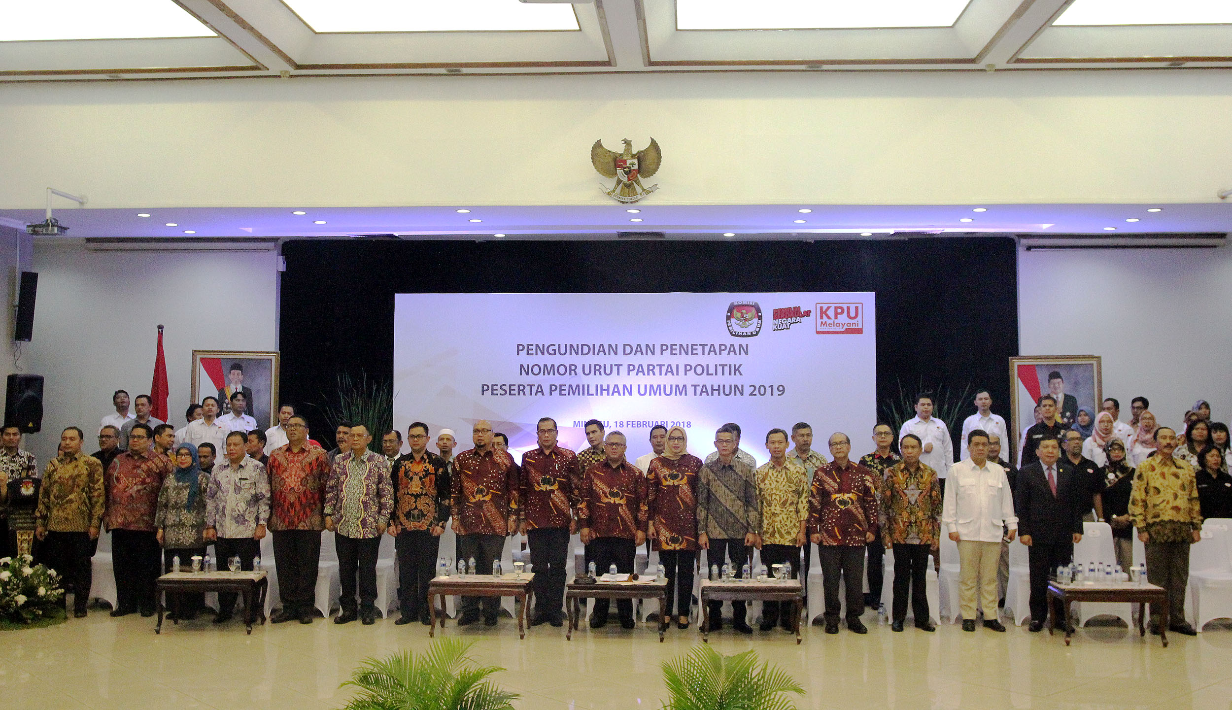 Ketua Bawaslu RI Abhan bersama anggota Bawaslu RI, Fritz Edward Siregar, Ratna Dewi Pettalolo, Mochammad Afifuddin dan Rahmat Bagja mengahadiri pengambilan nomor urut peserta partai politik Pemilu Tahun 2019 di Gedung Komisi Pemilihan Umum (KPU), Jalan Imam Bonjol, Menteng, Jakarta Pusat, Minggu, (18/2/2018). Pengundian ini merupakan kegiatan tindak lanjut setelah KPU menetapkan Partai Politik peserta pemilu sebagaimana ketentuan Undang-Undang dan KPU akan menuangkan nomor atur untuk 14 Partai Politik dan empat Partai politik lokal. Photo : Humas-Nurisman