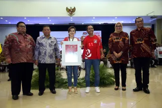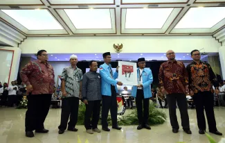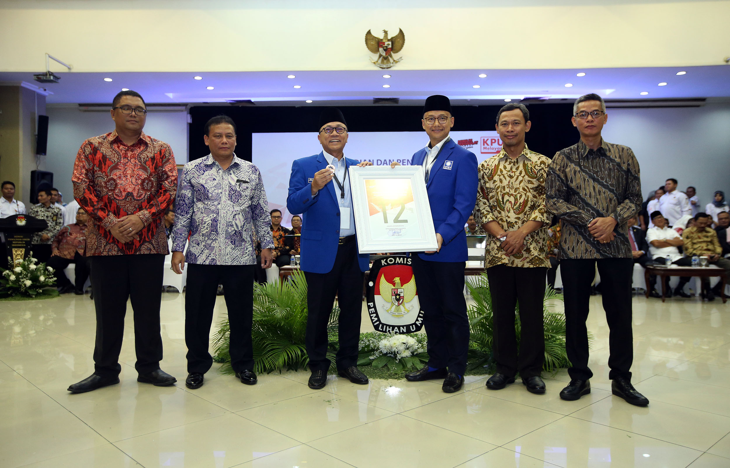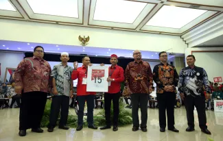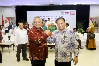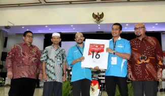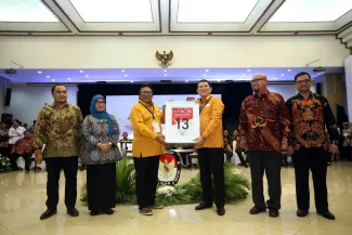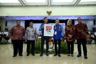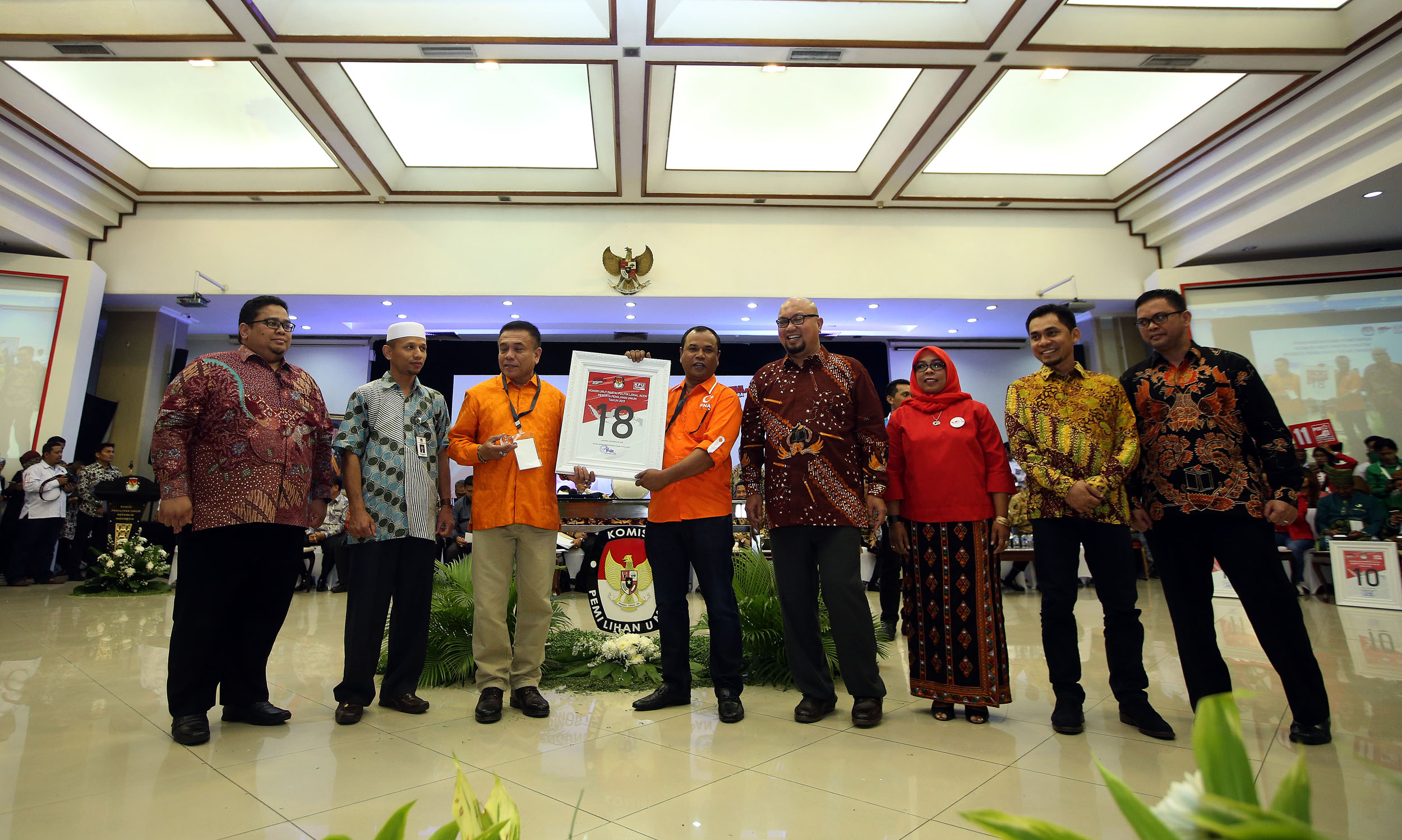 Ketua Bawaslu RI Abhan bersama anggota Bawaslu RI, Fritz Edward Siregar, Ratna Dewi Pettalolo, Mochammad Afifuddin dan Rahmat Bagja mengahadiri pengundian dan penetapan nomor urut partai politik peserta Pemilihan Umum Tahun 2019 di Gedung Komisi Pemilihan Umum (KPU), Jakarta, Minggu, (18/2/2018). Pengundian ini merupakan kegiatan tindak lanjut setelah KPU menetapkan Partai Politik peserta pemilu sebagaimana ketentuan Undang-Undang dan KPU akan menuangkan nomor atur untuk 14 Partai Politik dan empat Partai politik lokal. Photo : Humas-Nurisman