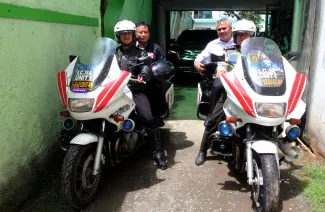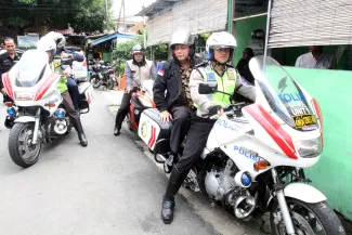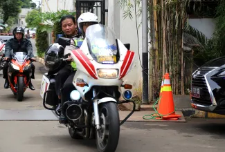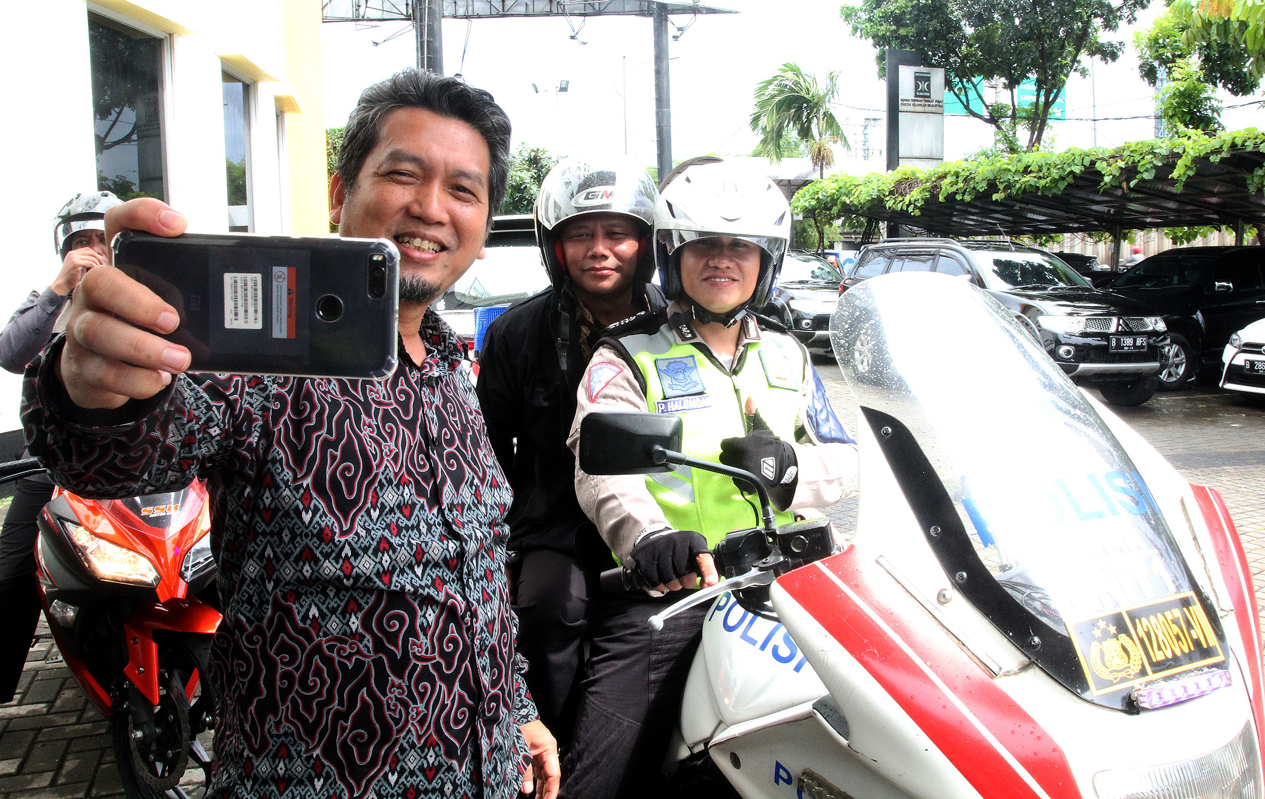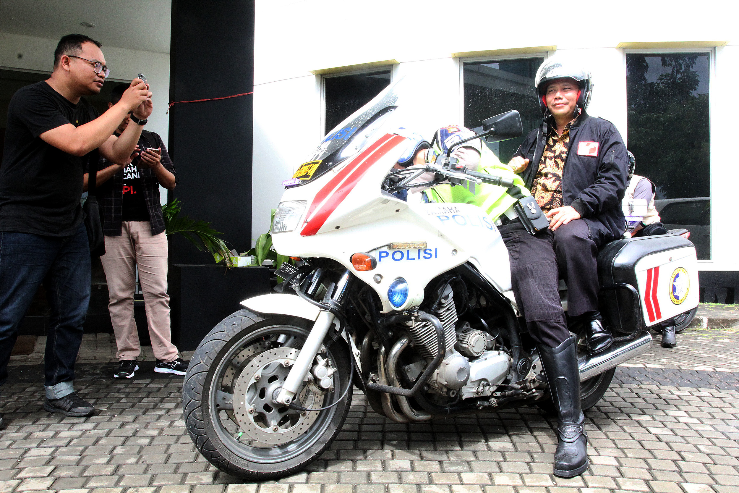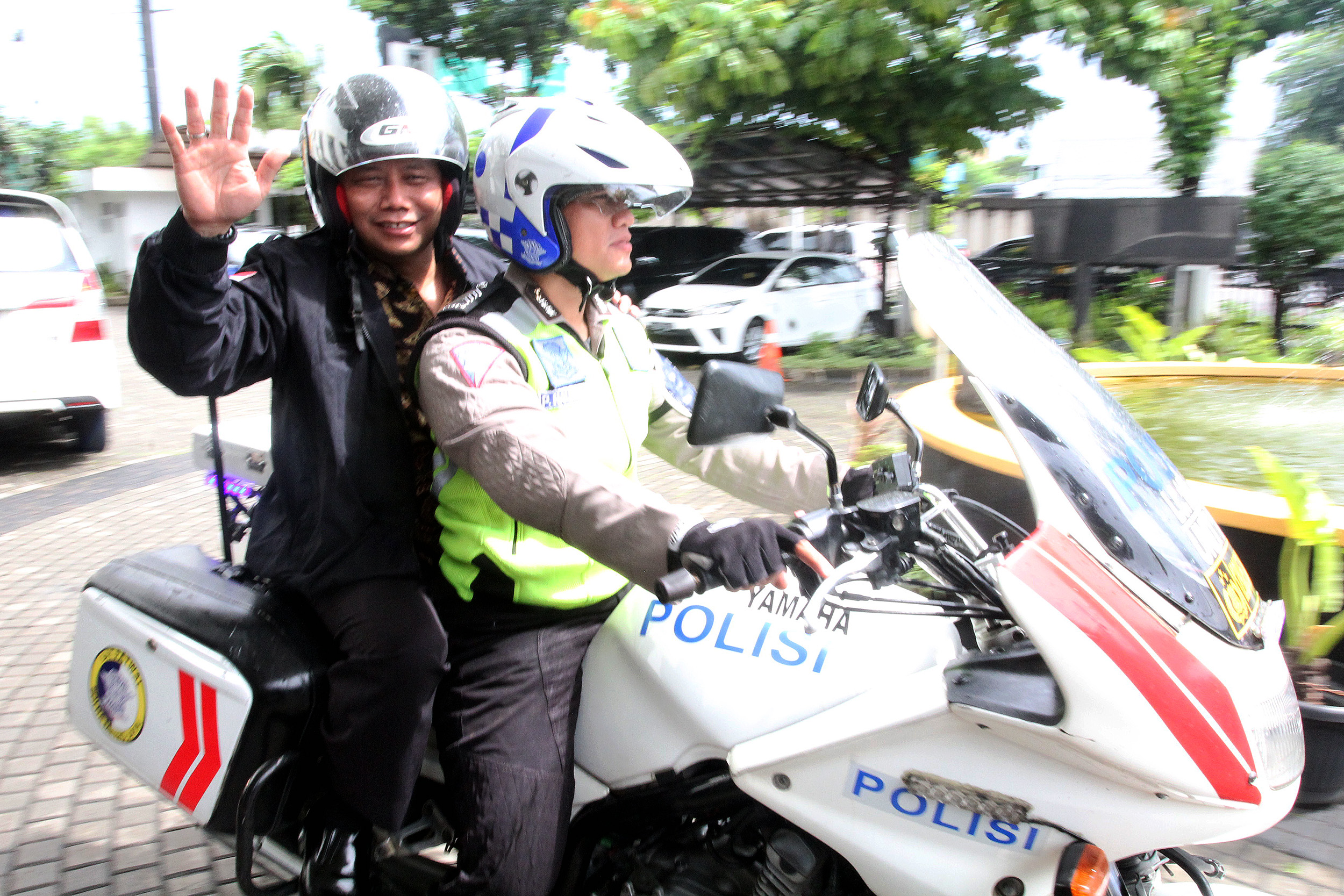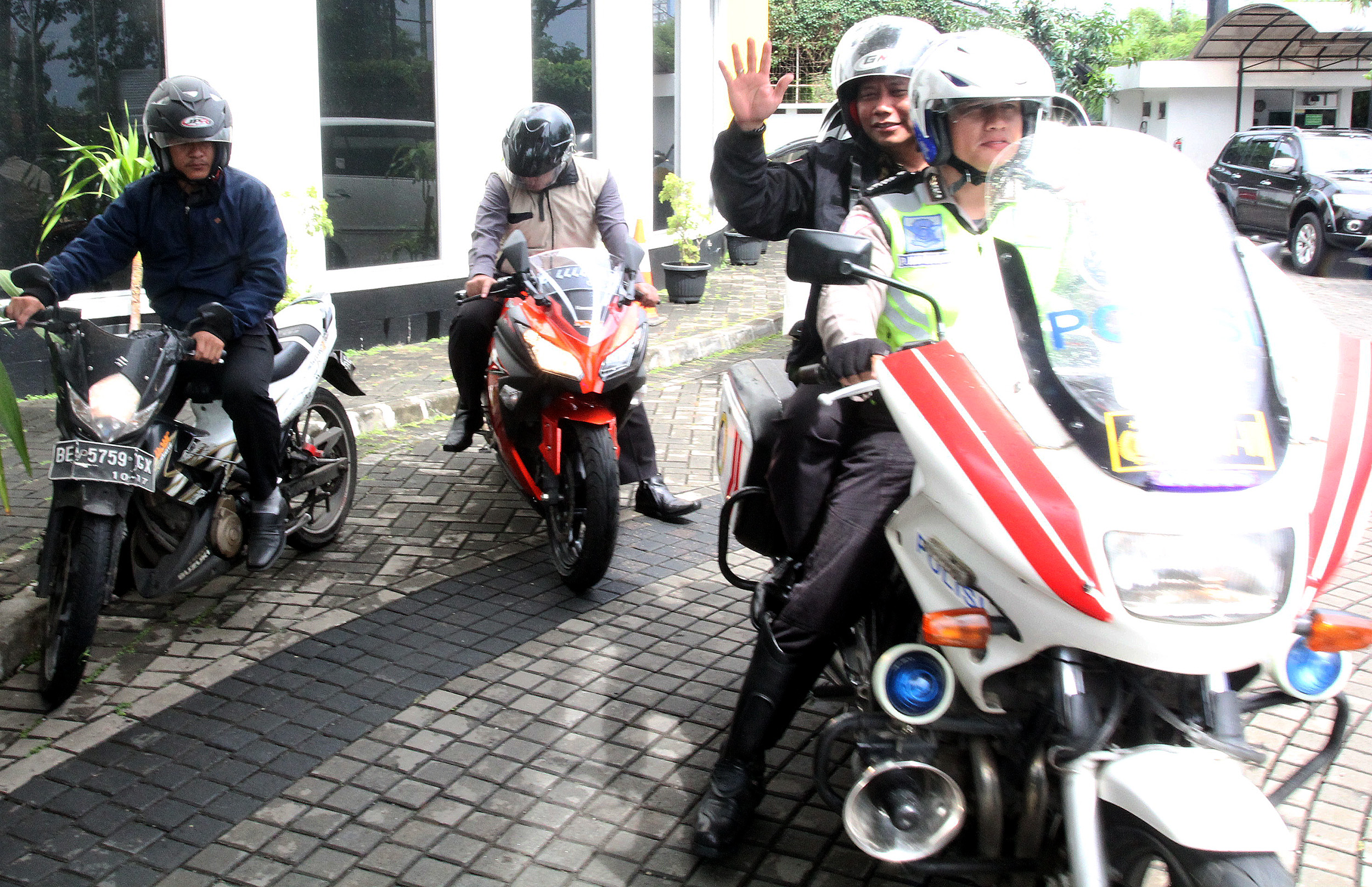 Ketua Bawaslu RI, Abhan bersama Ketua KPU RI, Arief Budiman membonceng petugas Patwal dari Kantor DPP Partai Kebangkitan Bangsa (PKB) di Jalan Raden Saleh, Senen, Jakarta Pusat menuju Kantor DPP PKS di Jalan TB Simatupang, Tanjung Barat, Jakarta Selatan, Senin (29/1/2018) dalam rangka verifikasi faktual partai politik untuk calon peserta Pemilu 2019. Karena harus mendatangi tujuh kantor Partai politik dalam sehari, maka keduanya pun memilih menumpang motor Patroli dan Pengawalan (Patwal) milik Polda Metro Jaya. Photo: Humas-Nurisman