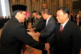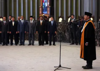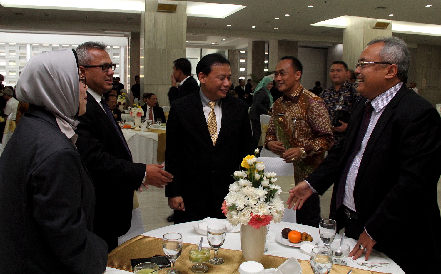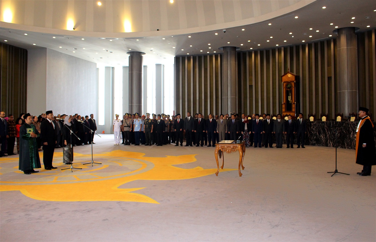 Ketua Bawaslu RI Abhan dan Sekretaris Jenderal Bawaslu RI Gunawan Suswantoro menghadiri Pelantikan dan Pengambilan Sumpah Jabatan Dua Anggota Badan Pemeriksa Keuangan Periode 2017-2022 di Gedung Mahkamah Agung Jakarta, Kamis (26/04).