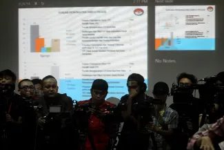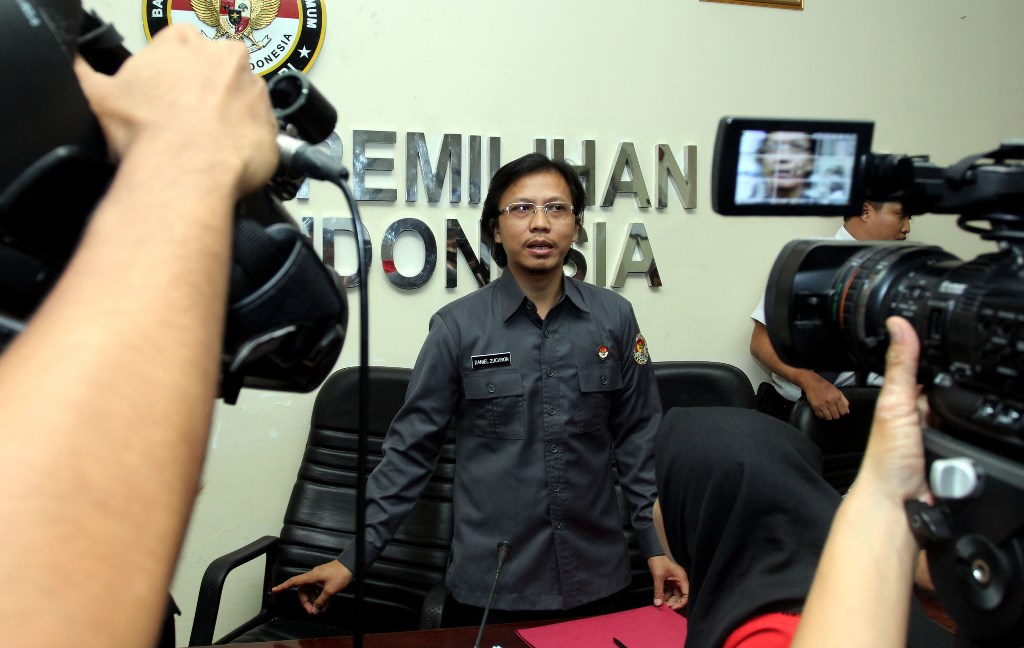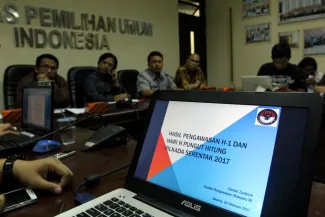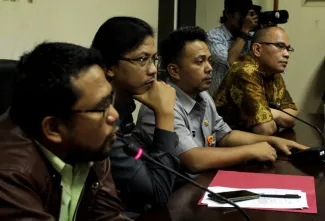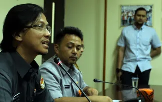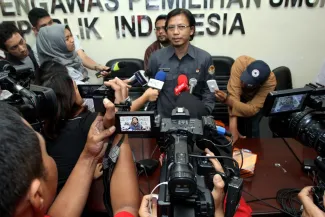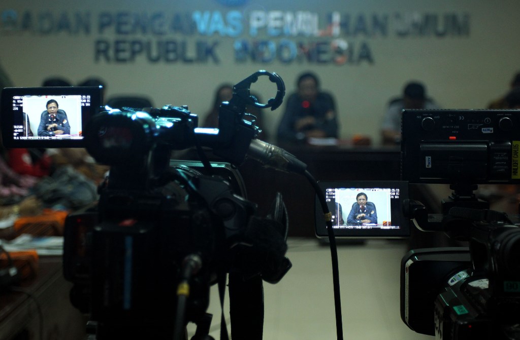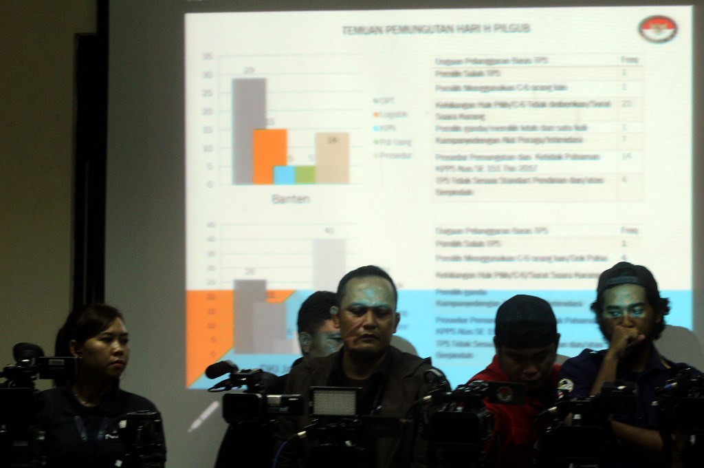 Jakarta, Badan Pengawas Pemilu -- Pimpinan Bawaslu RI Daniel Zuchron didampingi Tenaga Ahli Bawaslu, Rikson Nababan (kiri), Kepala Bagian Teknis Pengawasan Pemilu, Harimurti Wicaksono (kanan), dan Kepala Bagian Humas dan Antar Lembaga, Johnly Pedro Merentek menggelar konferensi pers tentang Hasil Pengawasan H-1 dan Hari Pungut Hitung Pilkada Serentak 2017, di Media Center Bawaslu RI, Jalan MH Thamrin Nomor 14, Jakarta, Kamis (16/2). Pada kesempatan tersebut, Daniel memaparkan hasil temuan dan laporan dugaan pelanggaran yang dihimpun Bawaslu RI dari 101 daerah yang menyelenggarakan Pemilihan Gubernur, Bupati dan Walikota di seluruh Indonesia. Photo: Humas-Nurisman