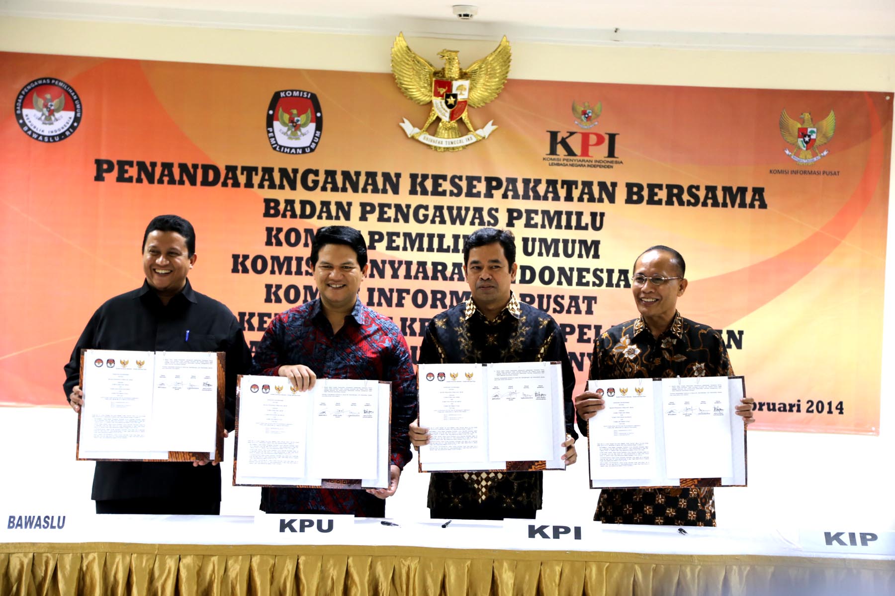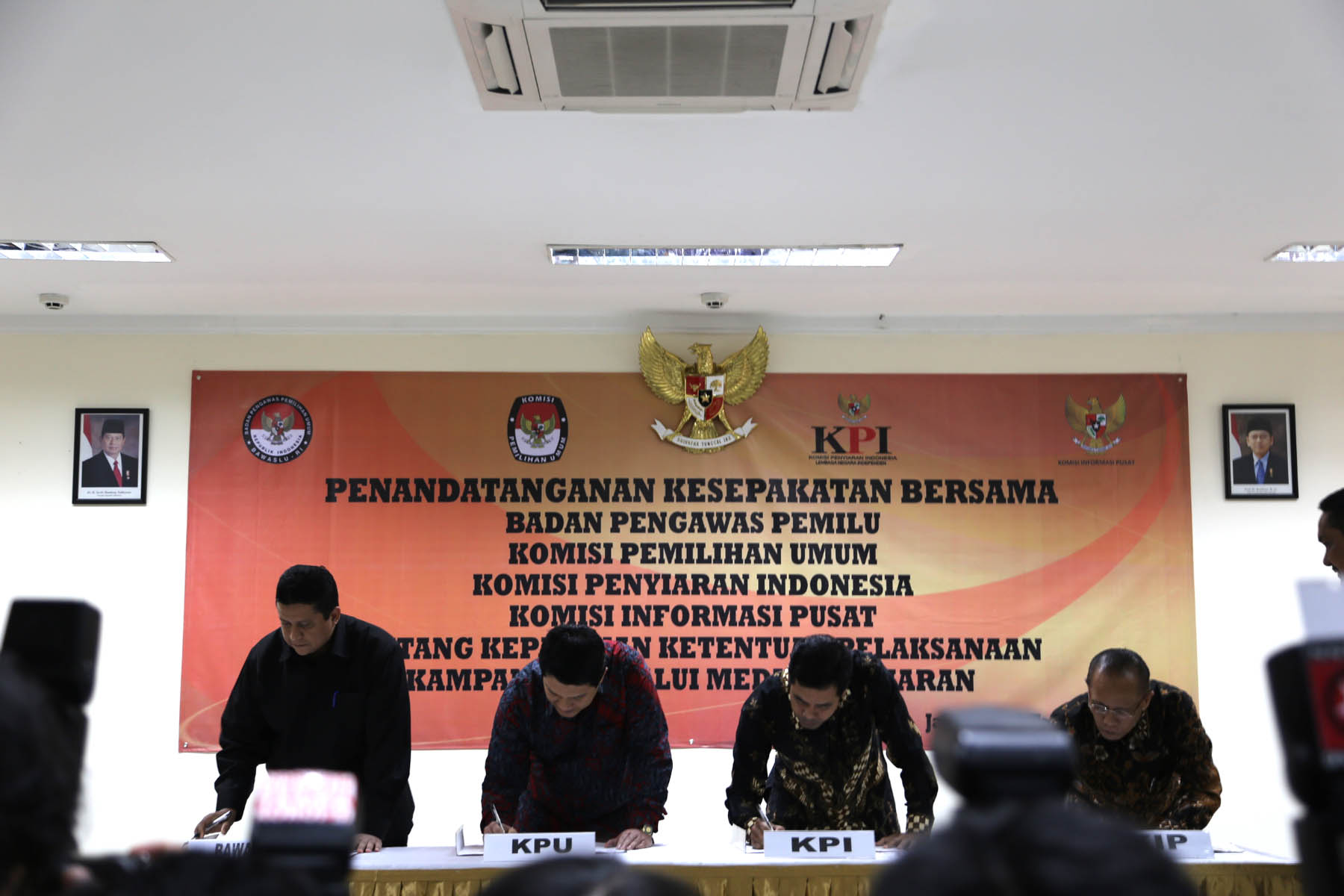 Para pimpinan lembaga negara yang terdiri dari Badan Pengawas Pemilihan Umum, Komisi Pemilihan Umum, Komisi Penyiaran Indonesia, dan Komisi Informasi Pusat sedang melaksanakan penandatanganan nota kesepahaman tentang pelaksanaan kampanya melalui media penyiaran.