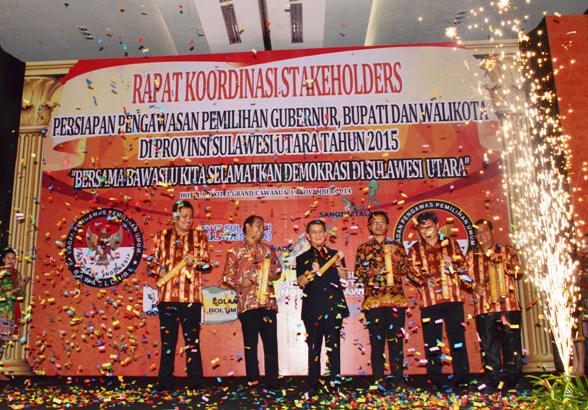 Manado, Bawaslu – Badan Pengawas Pemilu Provinsi Sulawesi Utara menggelar Rapat Koordinasi Stakeholders Persiapan Pengawasan Pemilihan Gubernur, Bupati dan Walikota di provinsi Sulawesi Utara Tahun 2015, Rabu (19/11) di Novotel GKIC Manado. Hadir dalam Rakor ini antara lain Ketua Bawaslu RI, Muhammad, Pimpinan Bawaslu RI, Daniel Zuchron, Pimpinan Bawaslu RI Endang Wihdatiningtyas, Gubernur Sulut, Sinyo Harry Sarundajang, Ketua Bawaslu Provinsi Sulut, Herwyn Malonda, Pimpinan Bawaslu Provinsi Sulut, Johny AA Suak, Pimpinan Bawaslu Provinsi Sulut, Syamsurijal AJ Musa, Kepala Sekretariat Bawaslu Sulut, Herry Z Mawuntu, DPRD Sulut, KPU/Bawaslu, Bupati/Wakil Bupati, Walikota/wakil walikota , ketua DPRD se-Sulut, KPU se Sulut, Pengawas Pemilu, tokoh Agama, Tokoh Masyarakat, Ormas, Pemantau Pemilu, Akademisi dan pemerhati politik di Sulut.