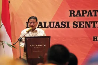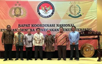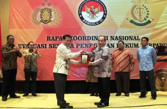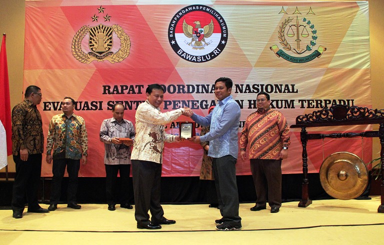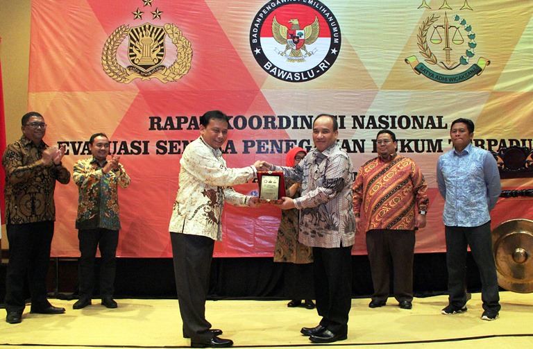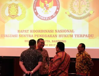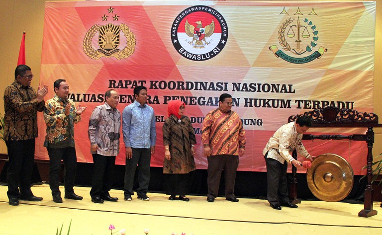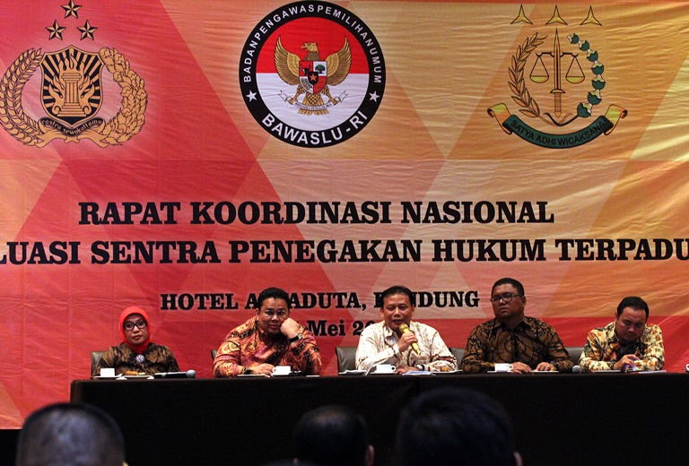 Rapat Koordinasi Nasional Evaluasi Sentra Penegakkan Hukum Terpadu resmi di buka oleh ketua Bawaslu RI, Abhan bersama anggota Bawaslu RI, Rachmad Bagja, Muhammad Afifuddin, Fritz Edward Siregar dan Ratna Dewi Petalolo, mala mini (23/5) bertempat di Hotel Aryaduta Bandung, Jawa Barat. Acara Rakornas Evaluasi Sentra Penegakkan Hukum Terpadu ini diikuti oleh tiga pilar instansi yang mengawangi pelanggaran tindak pidana pemilu yakni Kejaksaan Agung, Kepolisian serta Bawaslu. Photo: Humas-Nurisman