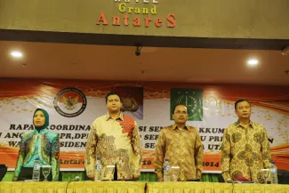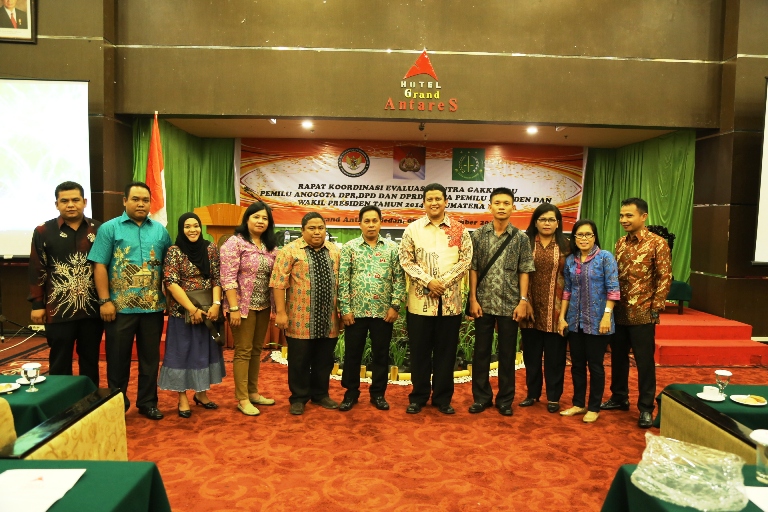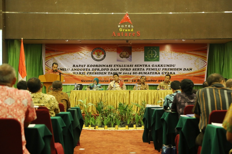 Medan, Badan Pengawas Pemilu –  Badan Pengawas Pemilu Provinsi Sumatera Utara mengelar Rapat Koordinasi Evaluasi Sentra Gakkumdu Pemilu Anggota DPR, DPD, dan DPRD serta Pemilu Presiden dan Wakil Presiden Tahun 2014 di Hotel Grand Antares Medan, Senin (8/9). Rapat Koordinasi Evaluasi digelar agar terwujudnya penganan tindak pidana pemilu yang lebih terkoordinatif pada tiga institusi Sentra Gakkumdu khususnya di Sumatera Utara.