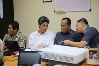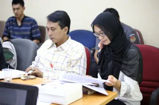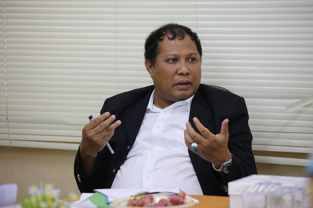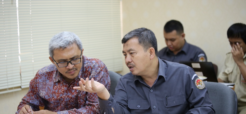 Pimpinan Bawaslu RI Nasrullah beserta Kepala Biro H2PI Jajang Abdullah, Wakil Ketua KIP John Fresly, Wakil Ketua KPI Iddy Muzayad, Kabag Humas KPU Robby Leo dan para pejabat juga staf di lingkungan masing-masing lembaga menghadiri rapat persiapan evaluasi Tim Gugus Tugas Pengawasan Iklan Kampanye Pileg dan Pilpres 2014 di gedung Bawaslu RI Jakarta (4/11). (AHI/WB)