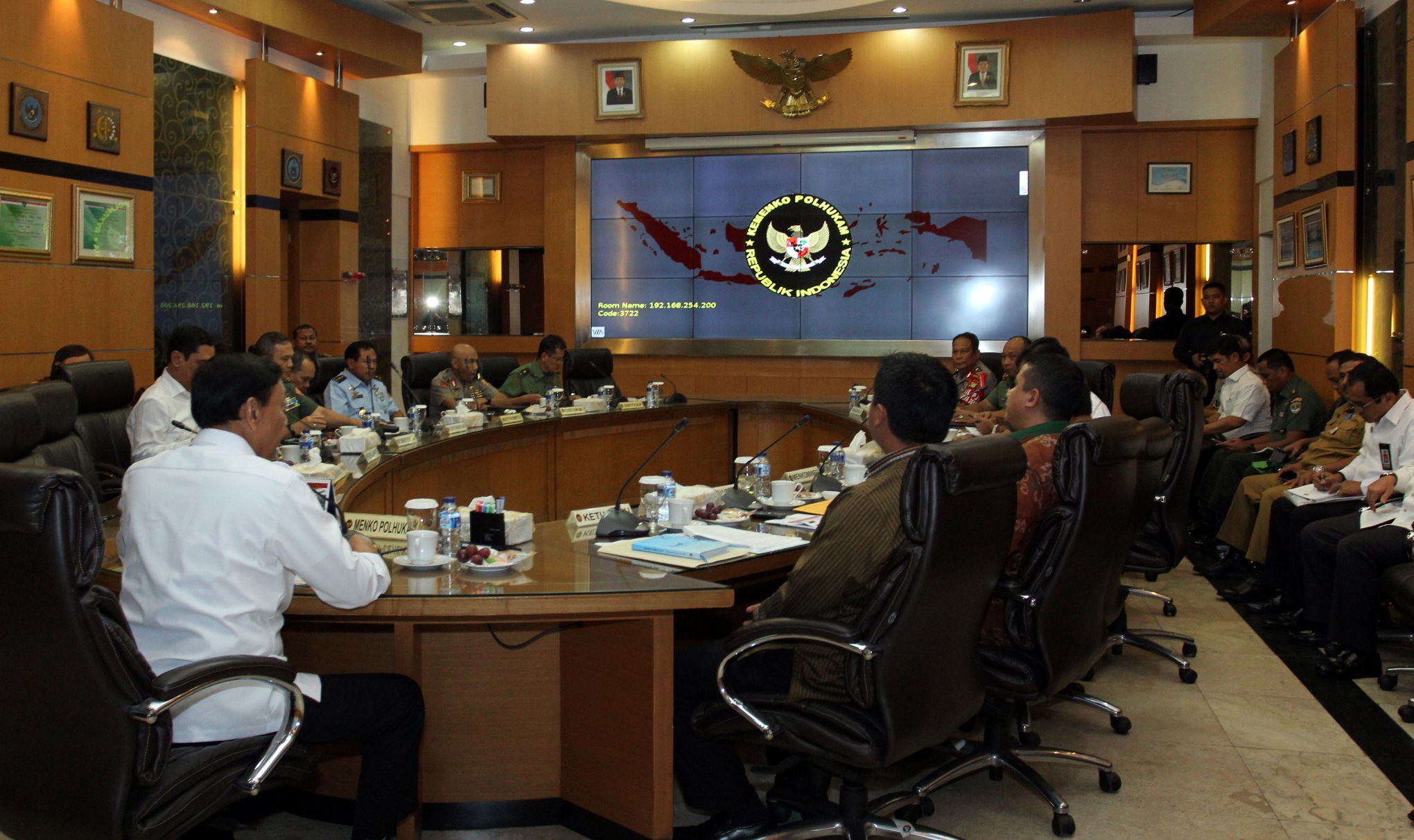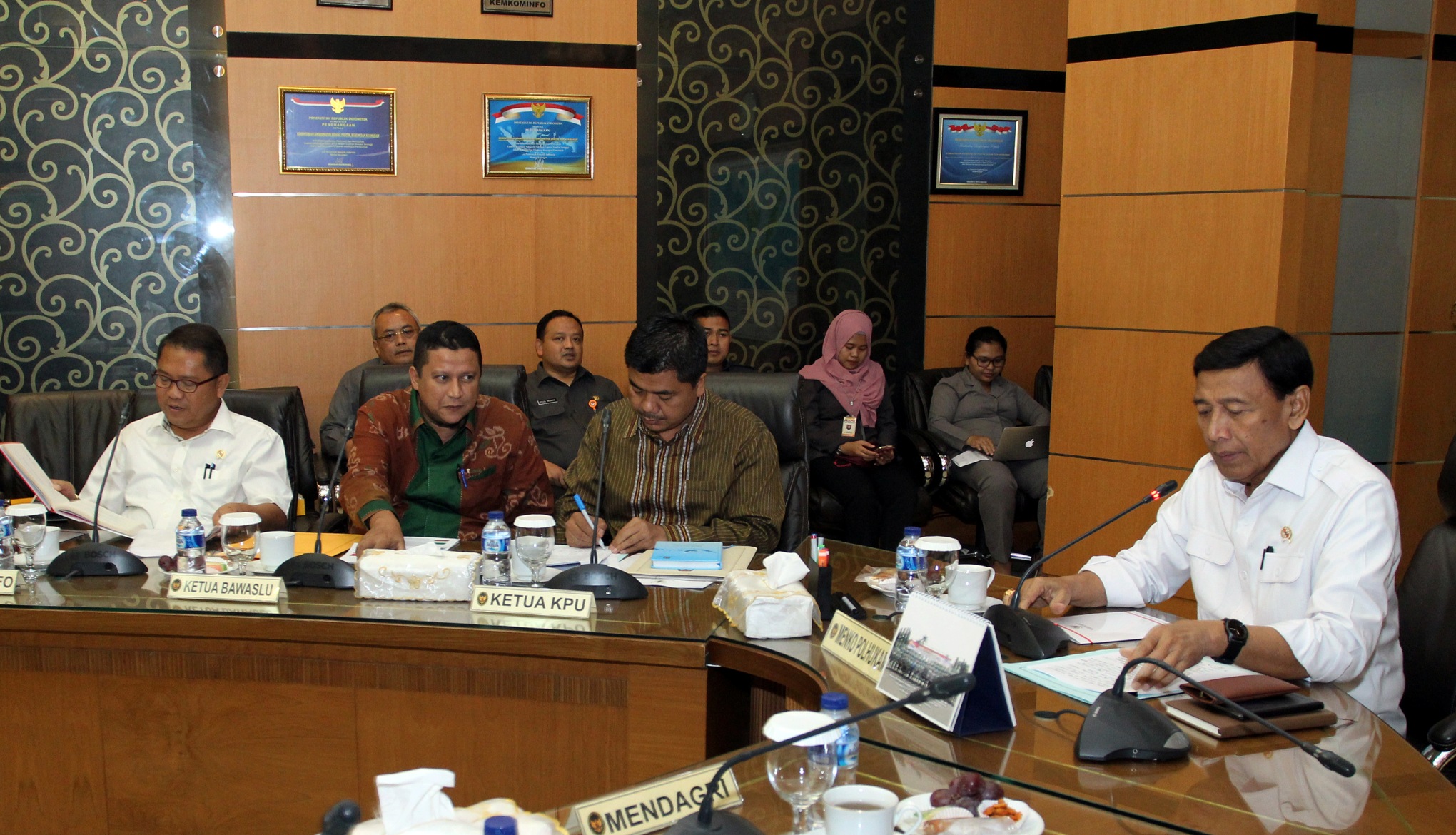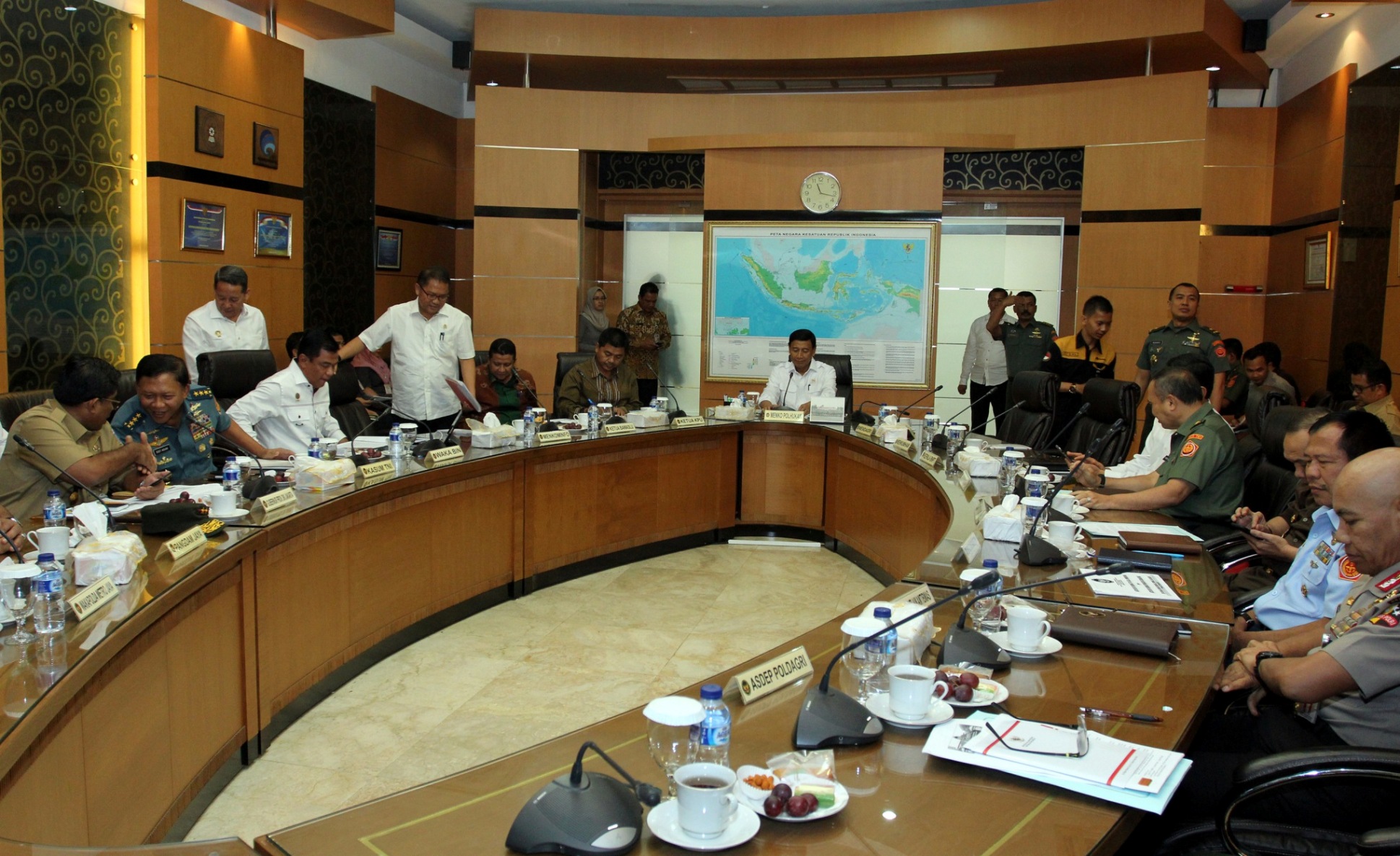 Kementerian Koordinator Politik, Hukum, dan Keamanan menggelar rapat persiapan menjelang penyelenggaraan Pilkada Serentak 2017 yang dihadiri oleh Ketua Bawaslu Muhammad, Wakil Kepala BIN Letjen Torry Djohar Banguntoro, Mendagri Tjahjo Kumolo, Menkumham Yasonna H Laoly, Pangdam Jaya Mayjen Teddy Lhaksmana, Plt Gubernur DKI Sumarsono, Kejaksaan, Wakapolda Metro Jaya dan Ketua KPU Juri Ardiantoro di Ruang Bima Kantor Kemenpolhukam, Jakarta, Senin (6/2). Photo: Humas-Nurisman
