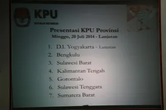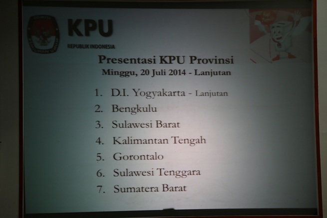 Rekapitulasi Nasional Pemilu Presiden dan Wakil Presiden tahun 2014 pada tanggal 20 Juli 2014 di KPU Jakarta telah menyelesaikan 15 Provinsi diantaranya kalimantan Barat, Nusa Tenggara Barat, Aceh, Sumatera Selatan, Kalimantan Selatan, Kepulauan Riau, Jambi, Bangka Belitung, Yogyakarta, Bengkulu, Sulawesi Barat, Kalimantan Tengah, Gorontalo, Sulawesi Tenggara dan Sumatera Barat