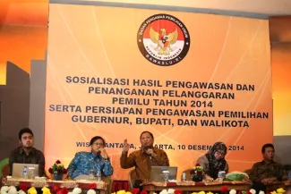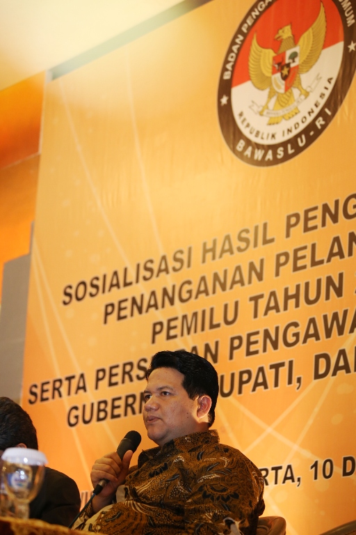 Jakarta, Badan Pengawas Pemilu - Badan Pengawas Pemilu (Bawaslu) menggelar Sosialisasi Hasil Pengawasan Dan Penanganan Pelanggaran Pemilu Tahun 2014 Serta Persiapan Pengawasan Pemilu Gubernur, Bupati dan Walikota Tahun 2015 di Jakarta, Rabu (10/12). Sosialisasi tersebut sebagai peningkatkan kualitas pengawasan bagi penyelenggara serta memberi input kepada partisipasi masyarakat dalam kesiapan menghadapi Pemilu Gubernur, Bupati dan Walikota Tahun 2015.